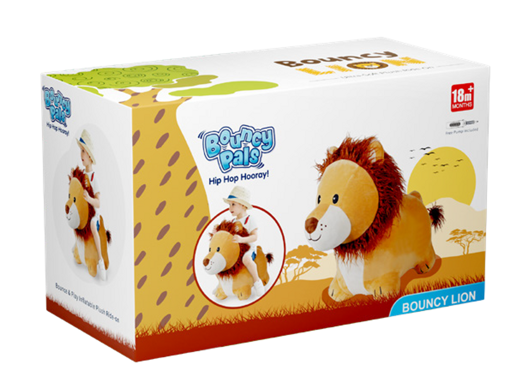 Bouncy Lion sports a mustard coat with a fluffy brown mane and tail made from ultra-soft plush fabric.