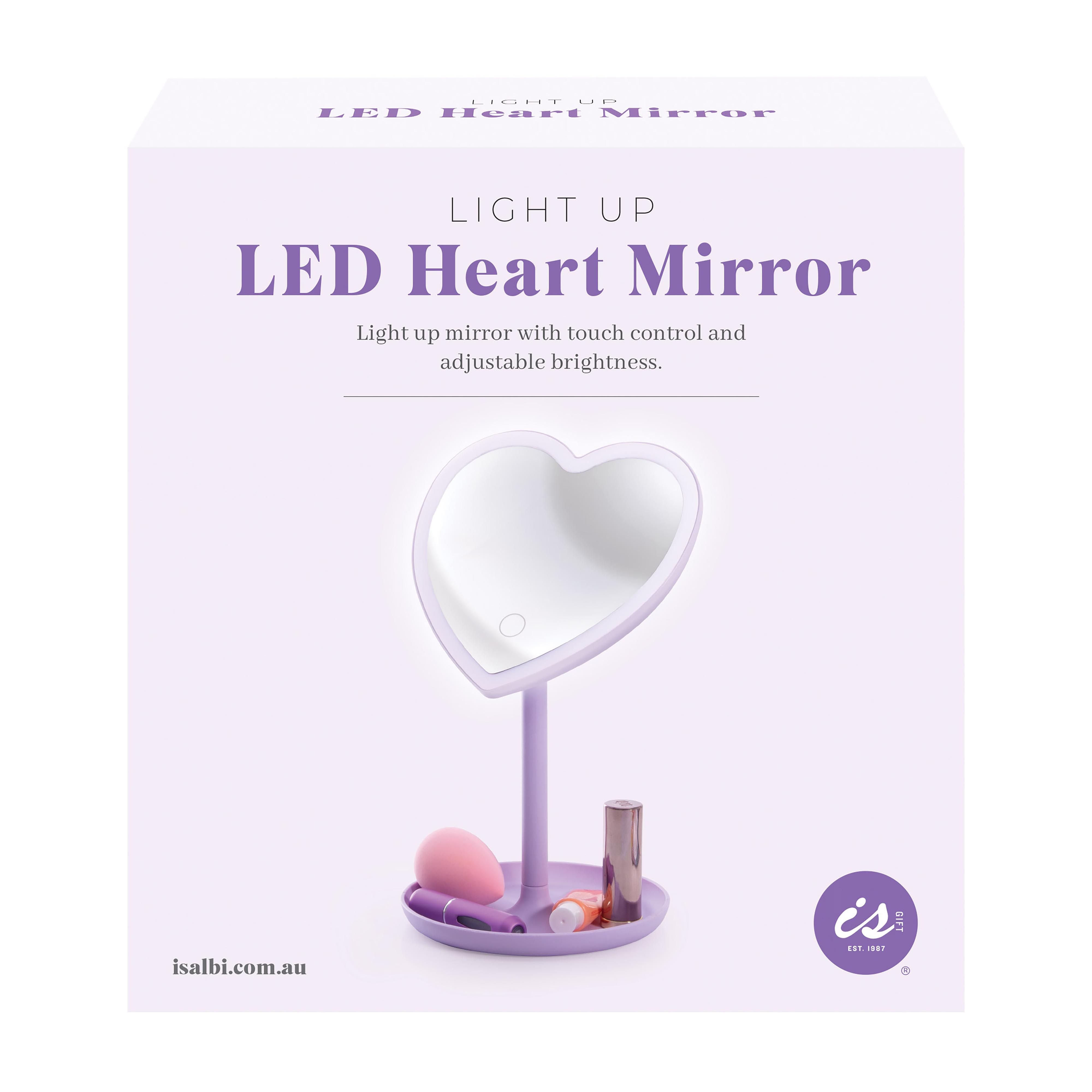 A lovely heart shaped light up mirror, perfect for applying makeup. Includes a touch sensor control with adjustable brightness!