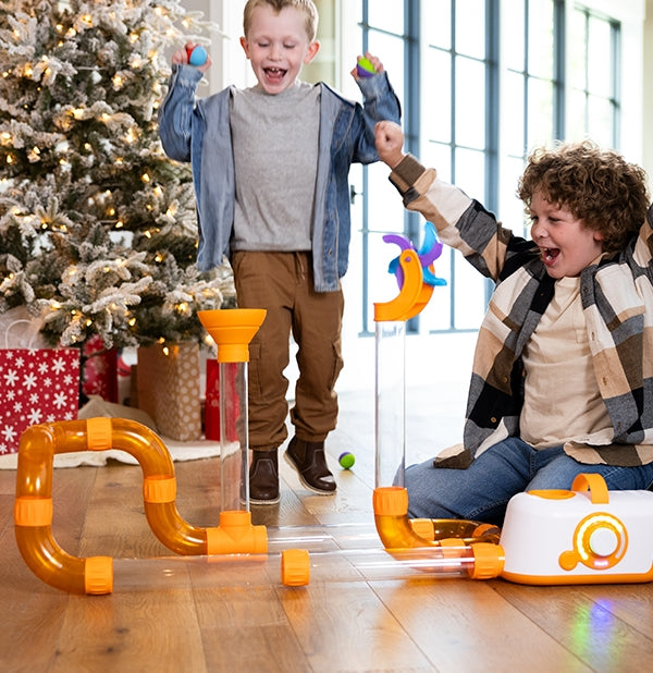 Windy dances wildly with the airflow while Whirly spins to kick the foam balls as they're launched from the tube. Both easily attach to the end of any tube.