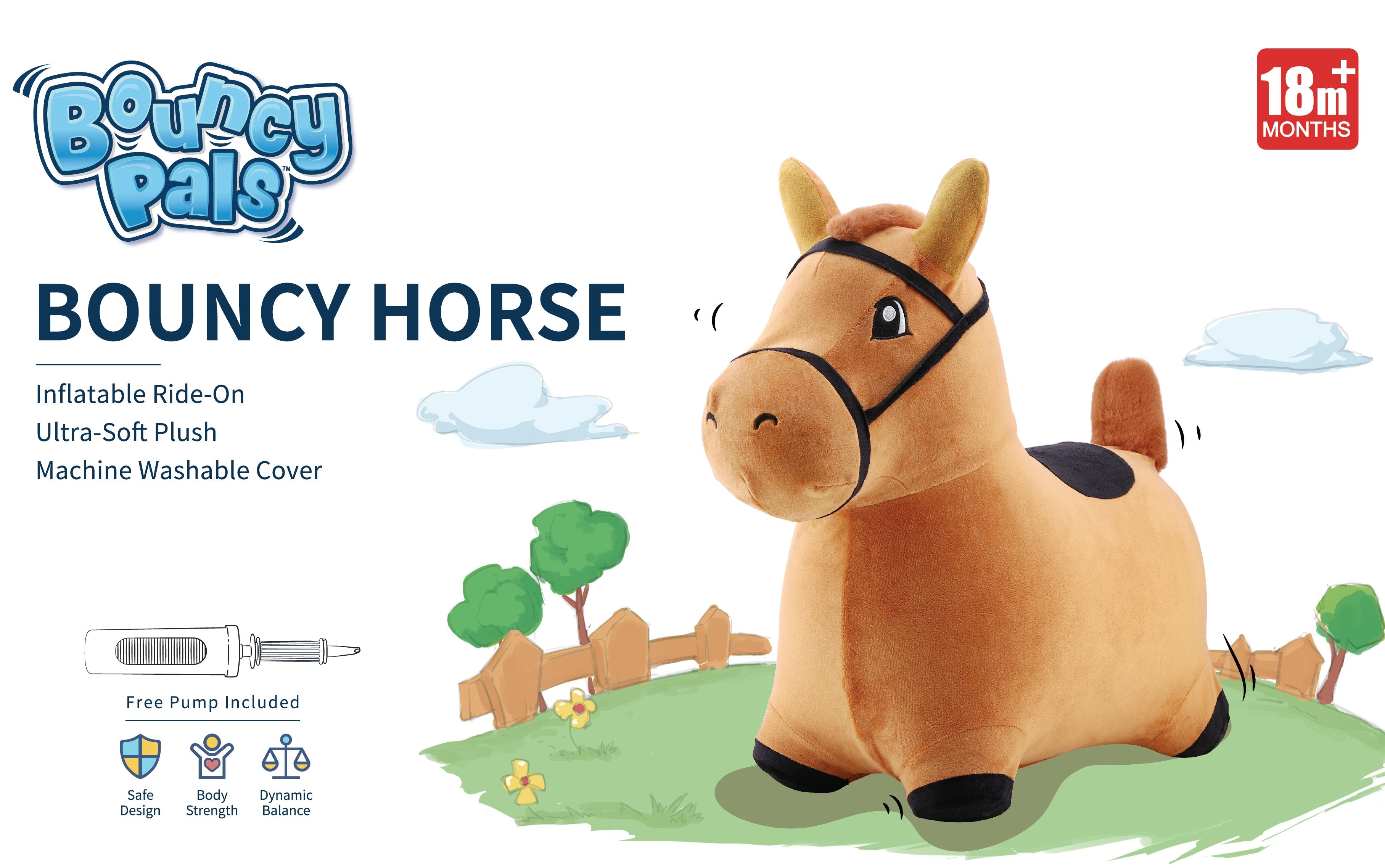 Bounce away with Bouncy Pals' Brown Horse - a zero-friction hopper made of safe, snuggly plush and ready to hop indoors and outdoors! This nifty bounce toy comes with a pump and is perfectly sized for 18 to 24 month old toddlers and 2 to 5 year old kids. What a treat! (Dimensions: 19.5"L x 9.5"W x 19.5"H; Weight: 3.22 lbs; Age: 3+ yrs).