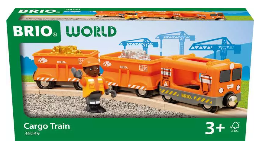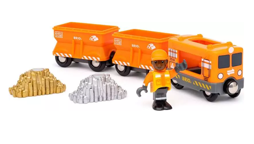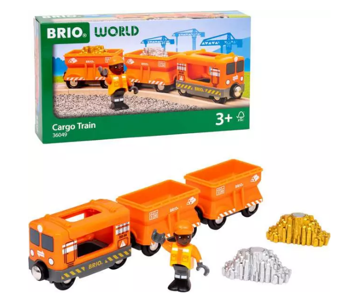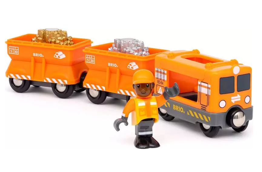 Haul the most precious loads with the 36049 Cargo Train. This vibrant orange toy train comes with two cargo wagons that are filled to the brim with gold and silver loads. Pop the engine roof open and drop the cargo-themed character into the driver’s seat before chugging off down the tracks. Equipped with classic BRIO magnetic connections, this toy train and accessories integrate seamlessly into BRIO World lift and load train sets and other cargo-themed toys.