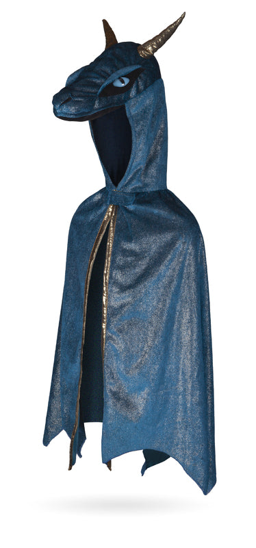 This gorgeous cape is fearless with its spectacular fiery blue eyes, dramatic golden spikes and horns, and a stuffed head with great design details. This cape will get your little one ready for countless hours of exciting playtime and fantasy-filled adventures. Crafted with soft and comfortable fabric and designed to look like a mysterious midnight blue sky with sparkles imitating millions of stars in the sky.