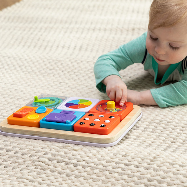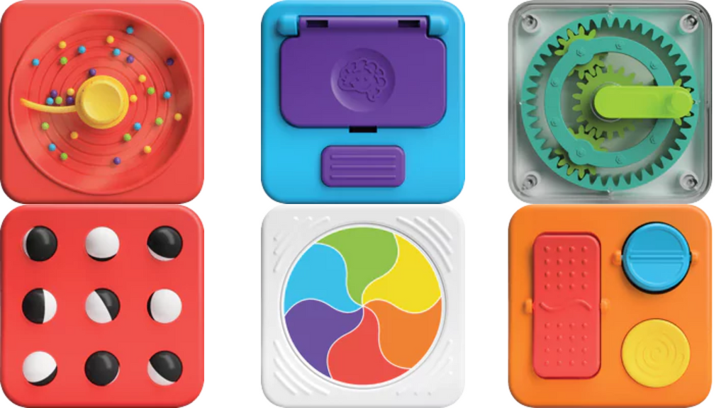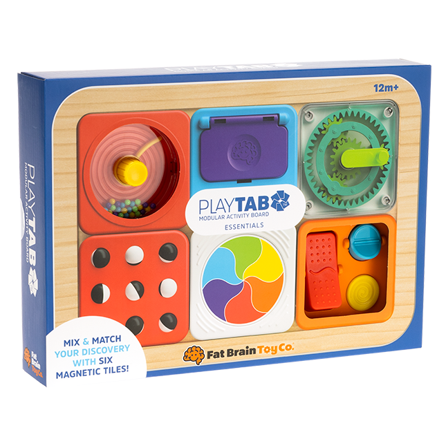 A modular sensory toy, PlayTab lets you build a unique experience packed with fine motor challenges, visual fascination, cause-and-effect discoveries, and more. This PlayTab Essentials set comes pre-loaded with six tiles - Sweeper, Latch Mirror, Gears, Trackball, Color Wheel, and Switches - but there are more for customers to collect and switch out as they like. There are buttons that squeak, colorful balls that roll through a maze, a dial that clicks from one to ten, squiggly tabs to flip back and forth... They all magnetically snap onto the tablet any way you want. Or, you can just throw a few in the diaper bag, or even stick them to the fridge! The classic activity board becomes more versatile and more open-ended with PlayTab.