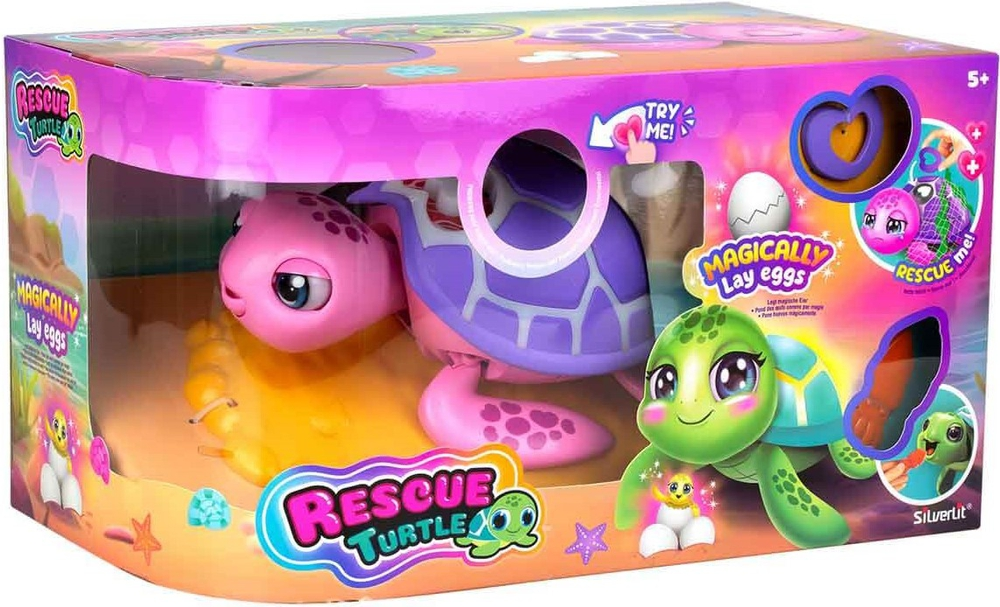 Meet the Silverlit Rescue Turtle - an adorable interactive pet that brings caring and surprise to life! Rescue your turtle by placing its missing shell piece back on, then watch it come alive with lights, sounds, and movement. Feed it with the included squid snack to keep it happy and discover a magical surprise as it lays up to three baby turtle eggs.