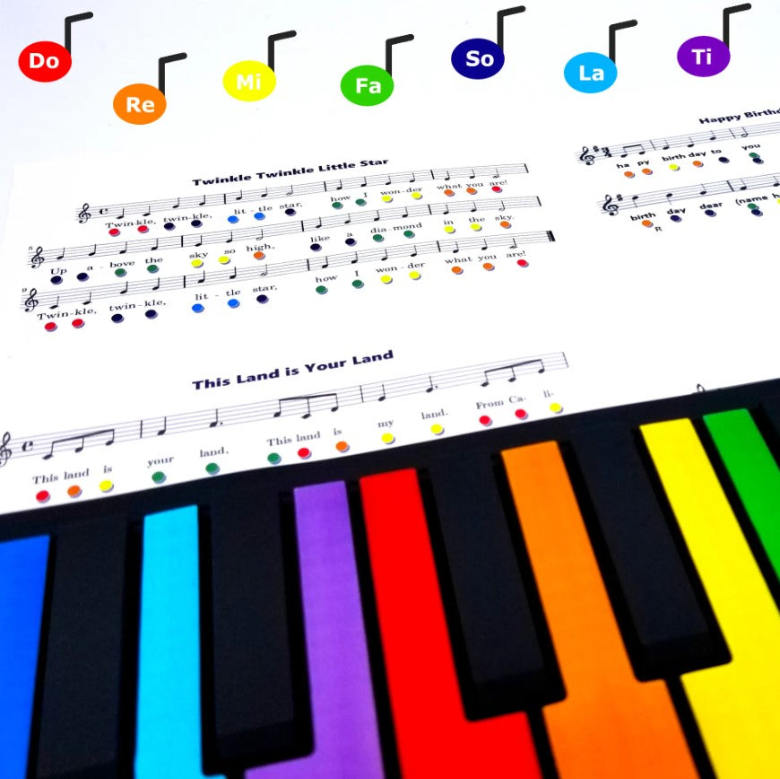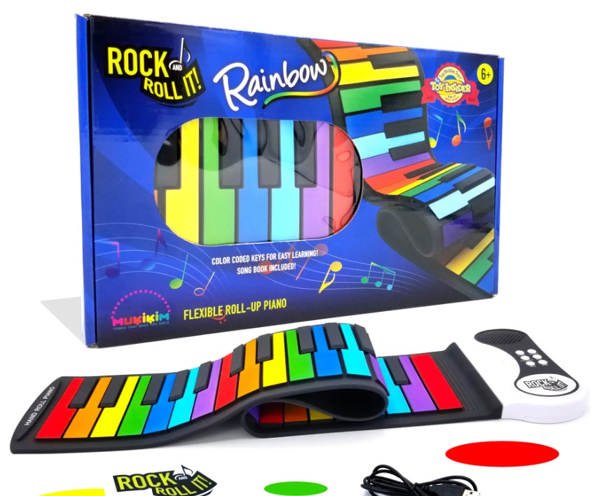 Rock And Roll It - Rainbow Piano • One of the best selling line; multiple Awards: Music Inc – Editor’s Choice / ASTRA Best Toy Award / TOTY 2019 • High Quality, Portable & Flexible Silicone Piano Pad • 49 Standard Rainbow Colored Keys • The Toy Insider Award Winner for Top Summer Toys & Holiday Toys / Music Inc. Editors Choice Summer NAMM Award • Play-By-Color Songbook • Open Window Package • USB (Cord Included) Or 4 AAA Batteries Powered • Professional Sounds • Multiple Keyboard Tones & Demo Songs / Built-In Speaker / Auxiliary Capabilities (Headphones Or External Speaker) / Record & Playback • Ages 6+