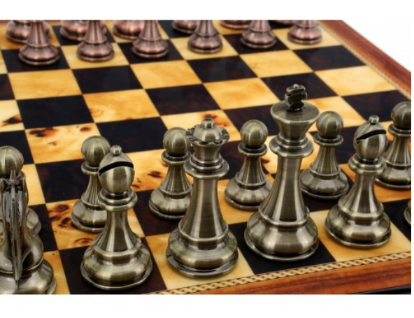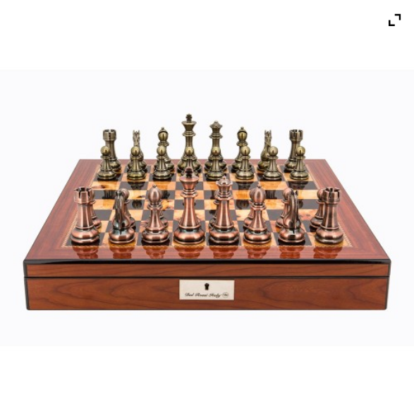 Dal Rossi Italy Copper/Bronze Chess Set on Walnut Shiny Finish Chess Box 20” with compartments
