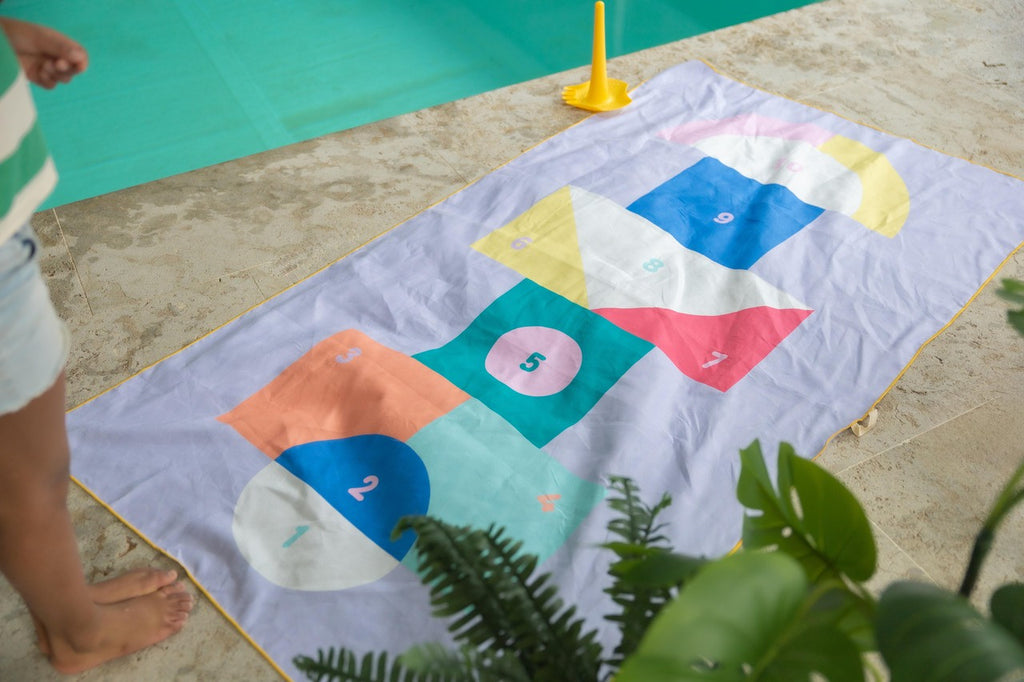 Make every trip to the beach, pool, or park twice as entertaining with the PLAYTOWELS Large Hopscotch Towel! This unique, double-sided towel brings fun and functionality together. One side features a classic hopscotch game, inviting kids and adults alike to play and move, while the reverse showcases a stylish graphic pattern. Measuring a generous 180 x 100 cm, this towel is perfect for lounging, drying off, or engaging in an impromptu hopscotch game anywhere you go.
