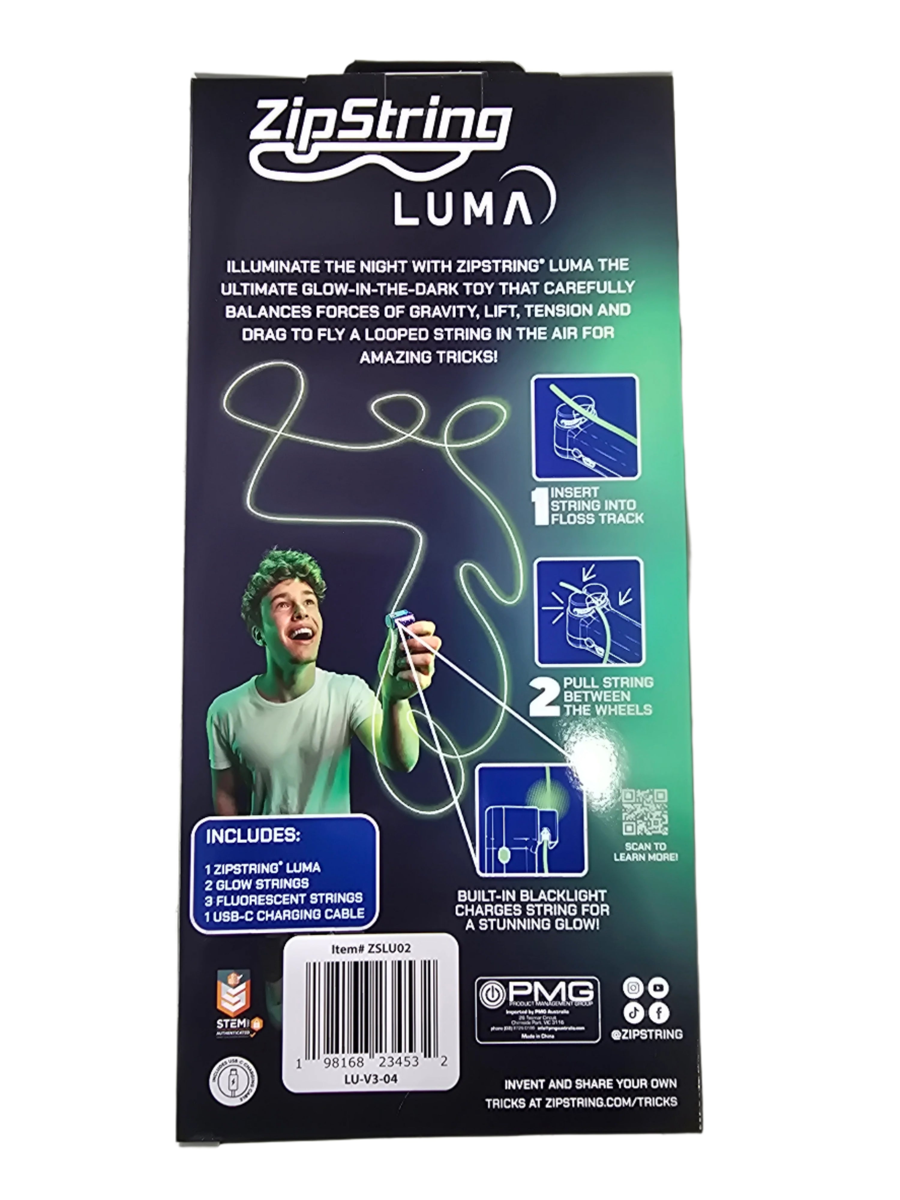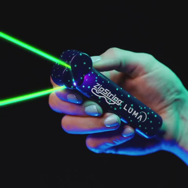 Light up the night with ZipString Luma — the glow-in-the-dark toy that flies a looped string for amazing tricks, shapes, and games.