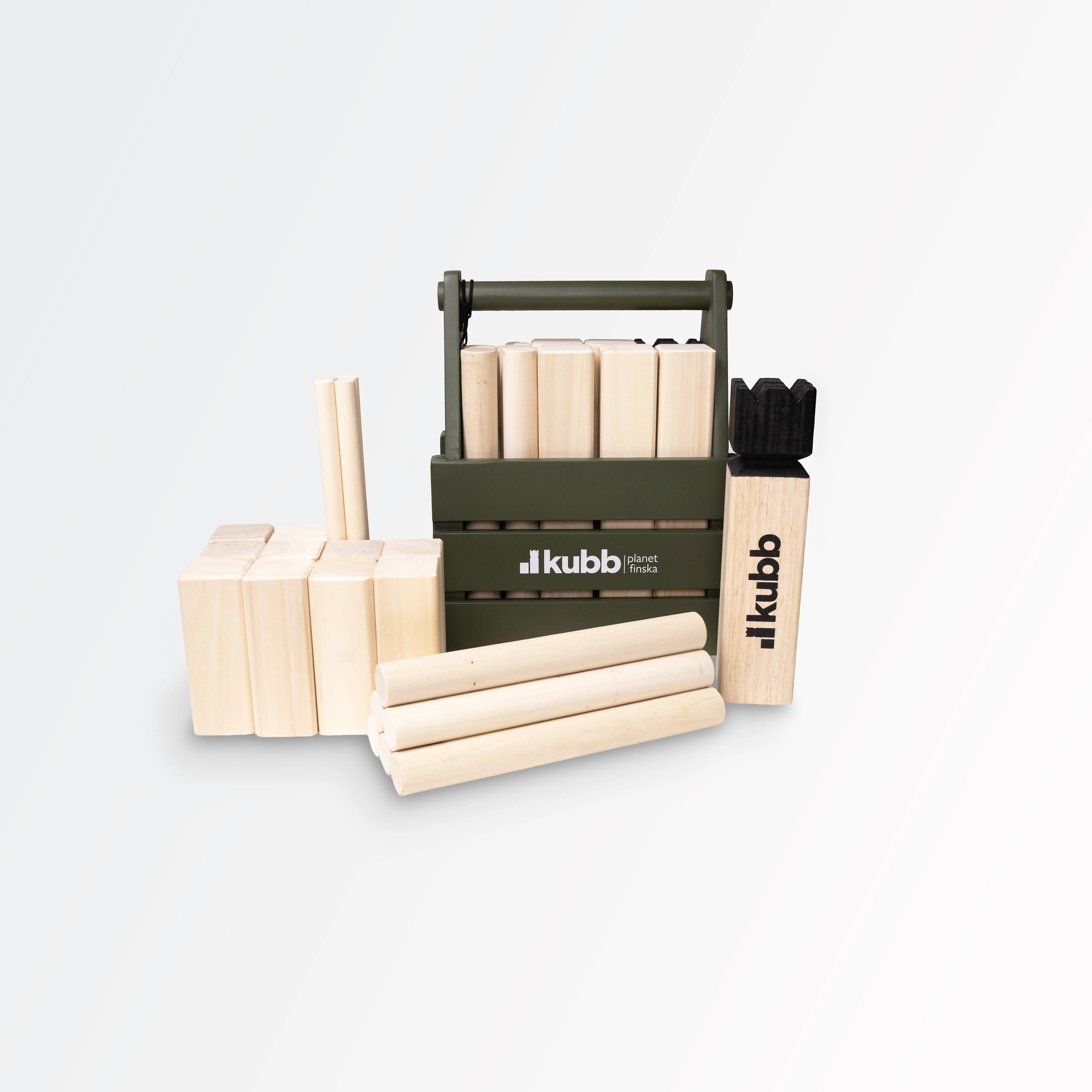 Kubb Original in the Moss Green Crate is identical to Kubb Original, but comes in a handy olive coloured Birchwood carry crate instead.
