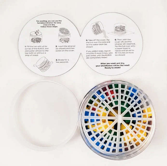 Includes 125 StickiKubes in 4 classic bright colours: Blue, Red, Yellow, and Green. Comes in a reusable plastic tub with built-in strainer for quick cleaning and easy storage.