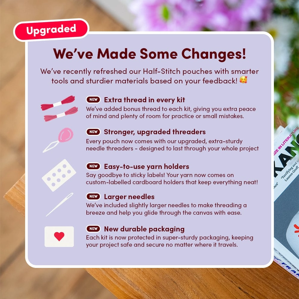 Bold, bright, and brilliantly retro. Pop Art is a color-lover’s dream. With vibrant pink tulips, stylised daisies, and a graphic black background, this is a retro-modern dream. Loud, fun, and totally one-of-a-kind. Made using our signature half-stitch technique, this kit is designed to be relaxing and accessible. Whether you're brand new to stitching or just looking for a satisfying side project, this kit makes it super easy to get started and even easier to finish. Plus, the compact size makes it ideal for popping it in your bag and taking your bits and bobs wherever you go! Pop Art Petals is bold, handmade, and one-of-a-kind.