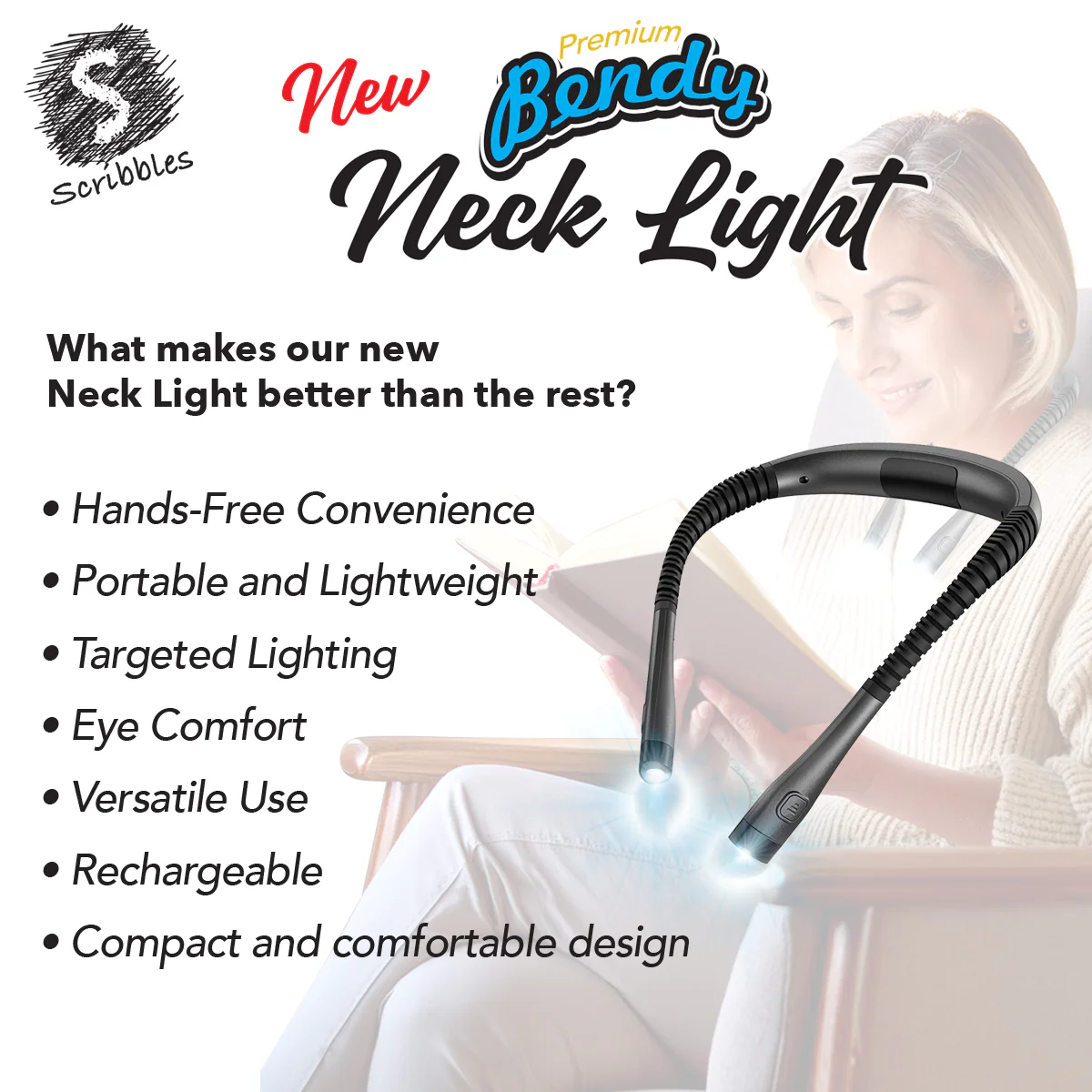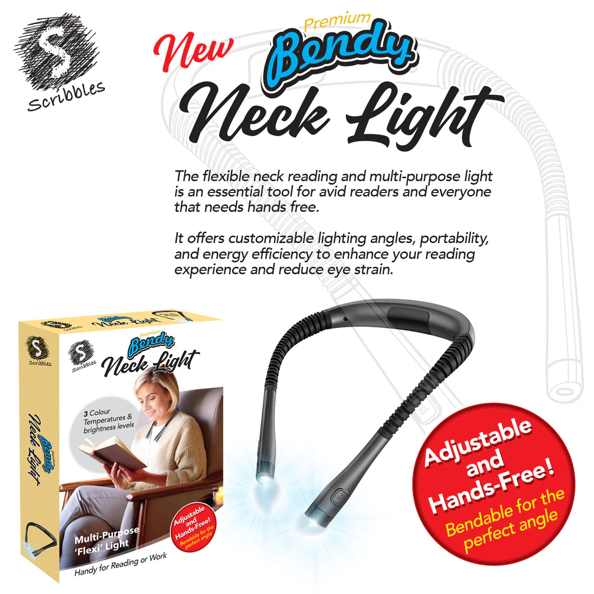 The Scribbles Premium Bendy Neck Light is a versatile, hands-free light perfect for reading, crafting, camping, and more. With 3 color modes (yellow, warm white, cool white), 6 brightness levels, and up to 80 hours of battery life, it's fully adjustable to suit your needs. USB Type-C charging, flicker-free LEDs, and ergonomic design ensure comfort and convenience. Its narrow beam design lights your space without disturbing others, making it ideal for shared environments.