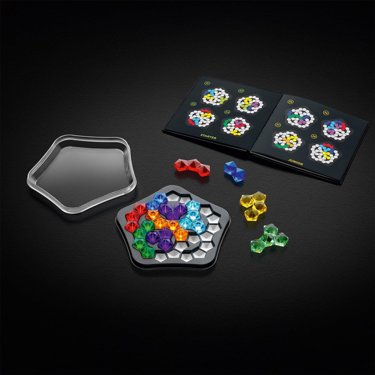 IQ LOGIC GAME — A sparkling puzzle delight for curious adults! Nestled in a stylish booklet and box, 120 intriguing challenges await to captivate even the toughest puzzle masters. Can you cleverly arrange all the clear pieces on this mysterious pentagon board?
