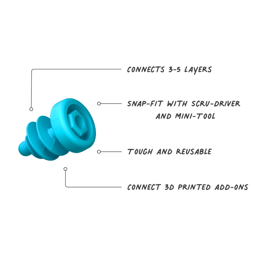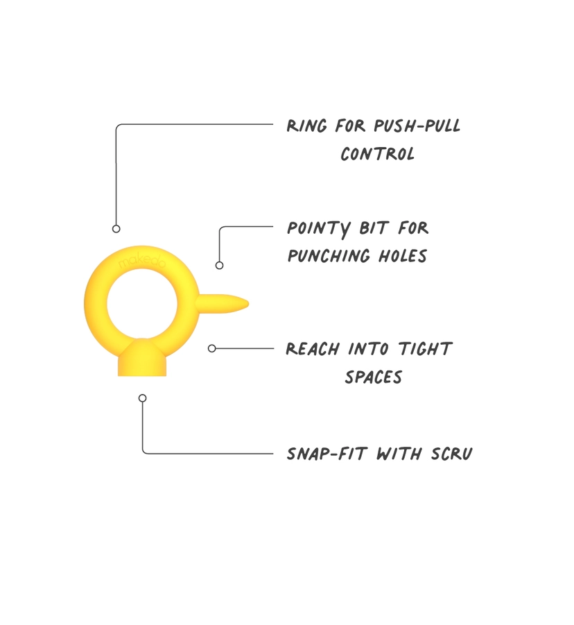 This is all you need to get started. Try Makedo for the first time with this basic starter pack or use it to top-up your existing Makedo. With the included MINI-TOOL, it’s ready to use out of the box so you will be constructing with cardboard in no time. See how easy it is to join cardboard together with Makedo: - Punch a hole through the material using the MINI-TOOL. - Insert a SCRU into the socket on the MINI-TOOL. - A few quick turns to securely connect the cardboard. 36 pieces. Contents: 28x SCRU 7x SCRU+ 1x MINI-TOOL