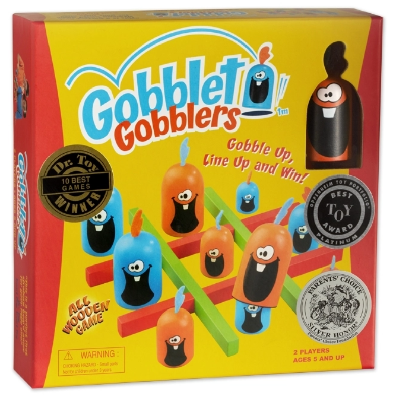 Cartoonish wooden characters bring pizzazz to this Tic-Tac-Toe style game. Just line up three of your Gobblers in a row to win. But watch out! These Gobblers are hungry for fun…and other Gobblers.