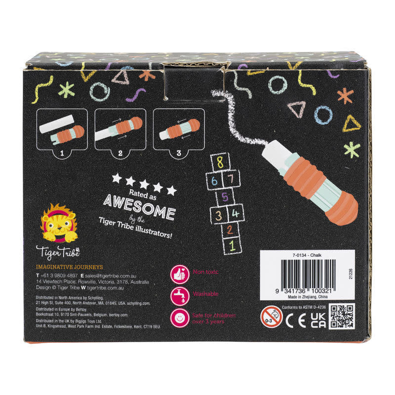 Each pack comes with 10 pieces of coloured, chunky chalk and an easy-grip chalk holder to help keep hands clean and make drawing easy.