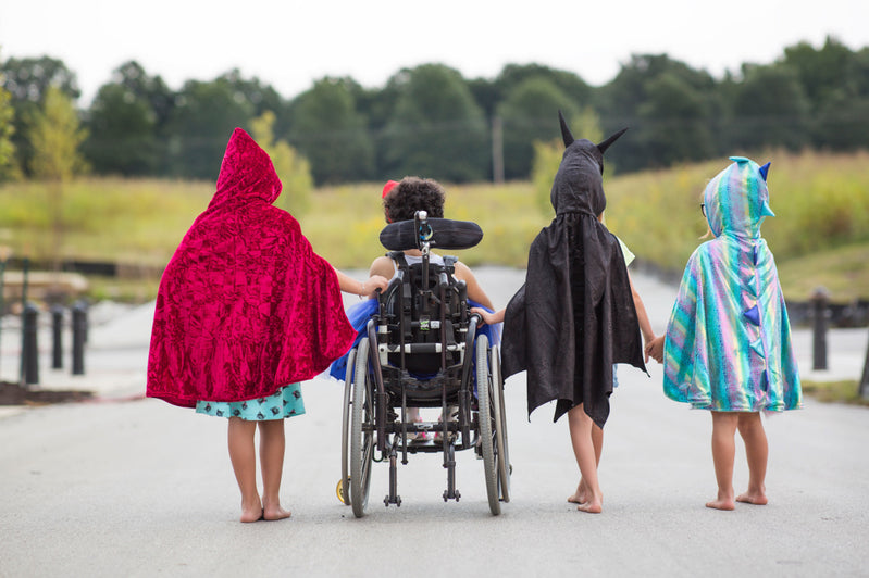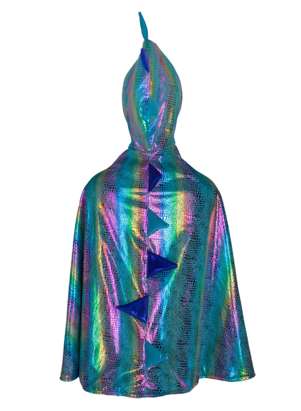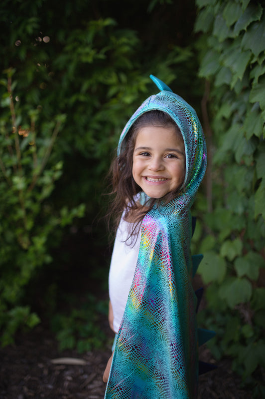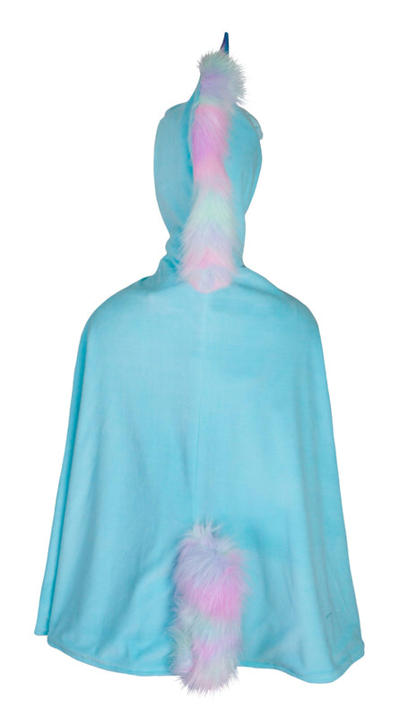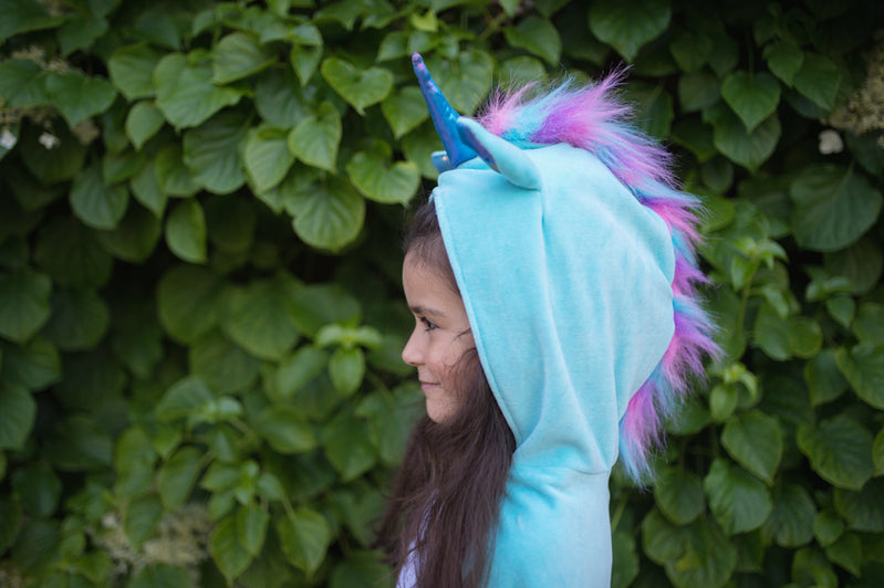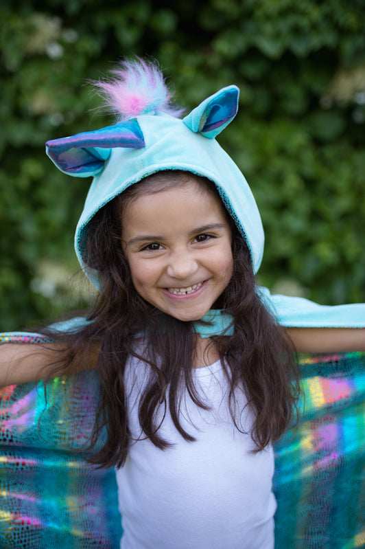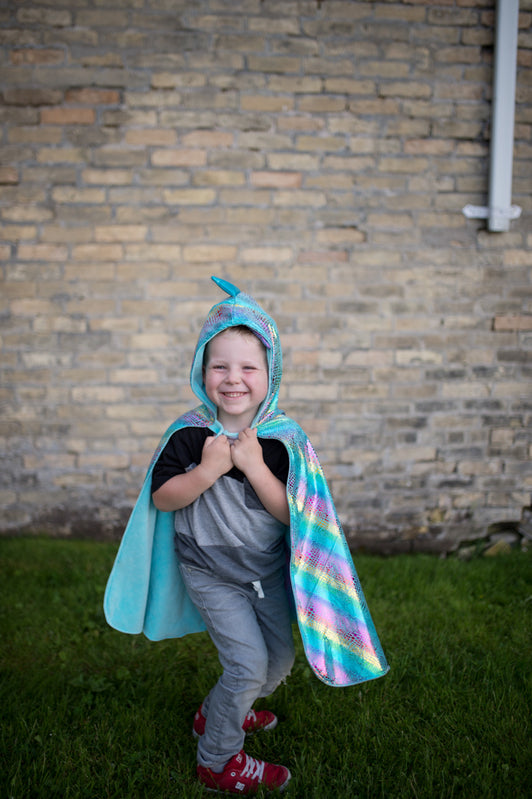 This reversible unicorn dragon cape is the ultimate book week dress-up item. Designed with bold bright colours of gorgeous aqua blue, lilac and pink, with shiny metallics and rainbow effects this cape is a winner. A bright dragon on one side equipped with protective scales from the hood all the way down the back, this cape turns into a soft fuzzy unicorn side with a faux fur mane and tail.
