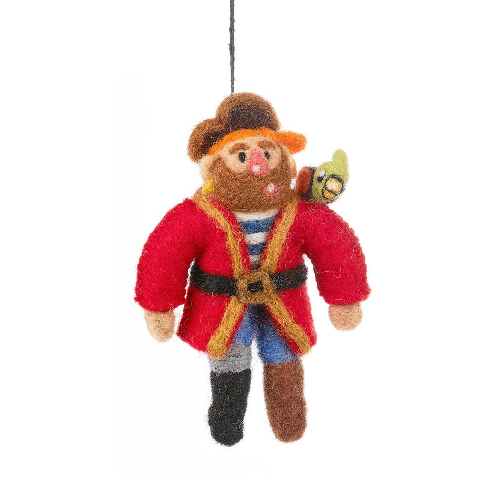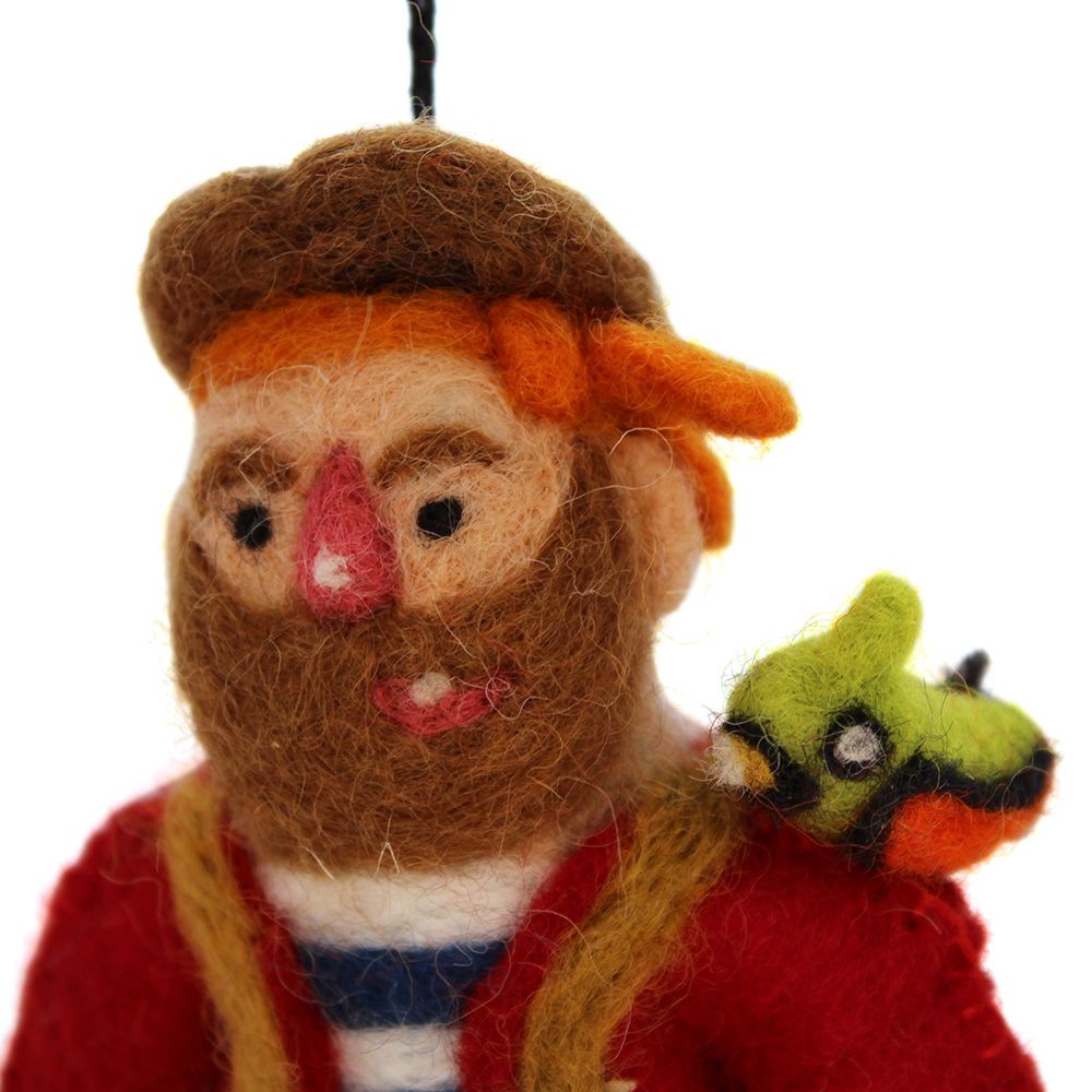 Pirate peg-leg Pete is never seen without his trusty companion on his shoulder, ready to sqwualk off any danger! There were all hands on deck in Nepal to create this gorgeously detailed decoration, and he sailed the seven seas to get here! Made entirely using needle felting techniques and sustainable, biodegradable materials.