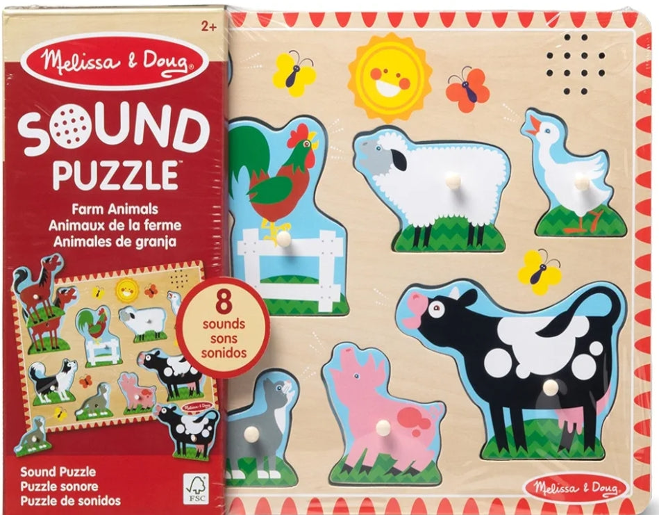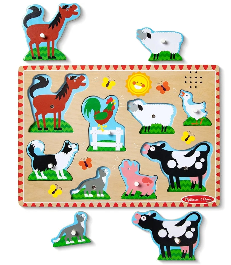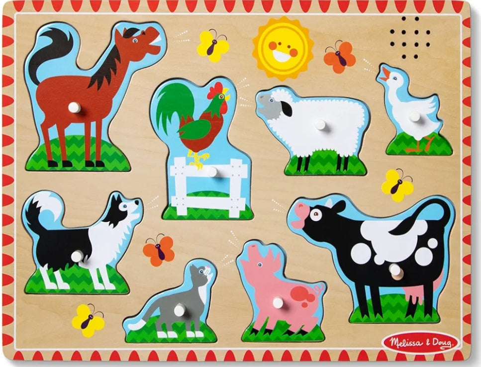 Each happy farm animal "sounds off" in its own voice when its animal puzzle piece is placed correctly in this eight-piece wooden peg puzzle! Your child will enjoy hearing all eight sounds and looking at the full-color, matching pictures under the pieces, while developing matching and listening skills with this captivating multisensory puzzle.