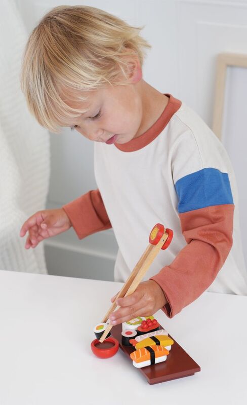 Perfect your chopstick skills with this delightful sushi set! It includes seven pieces of differently shaped sushi that are fun to pick up and dip into soy sauce and wasabi. The set is presented on a charming small platform-style table, making it an inviting addition to playtime. This engaging toy encourages manual dexterity through pretend play, allowing little ones to develop their coordination while enjoying a taste of Japanese culture.