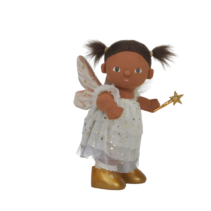 With magnets hidden in her hands, Freya can hold her star wand, fairy snacks, or even a tiny unicorn - ready for any adventure. Her plush wings shimmer with every spin, and her glittery shoes are made for stardust-stomping and fairy footwork. She’s dressed to enchant in a tulle dress and frilly socks, and her soft cotton body is perfect for big squeezes and sweet dreams.