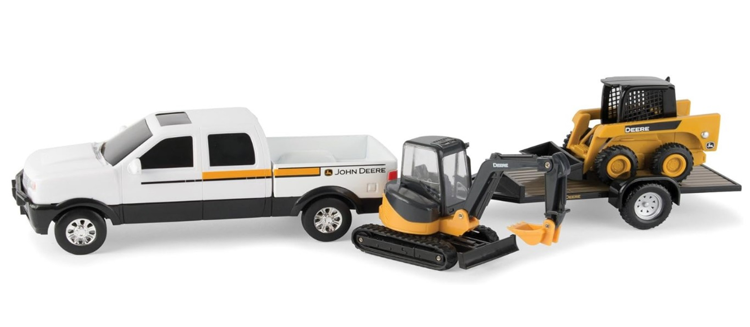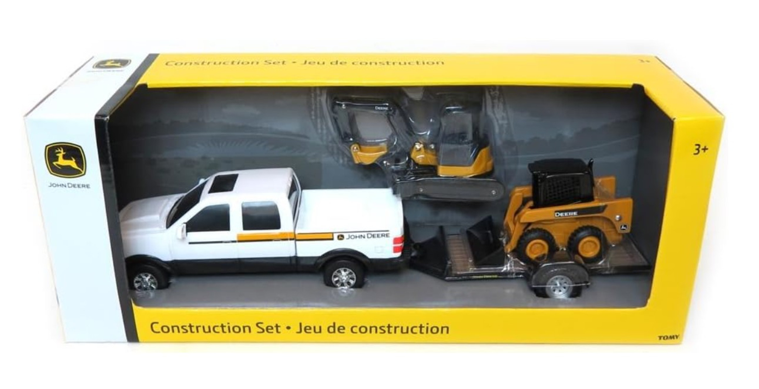 Three rugged John Deere machines packed with construction excitement! This set features an eight-inch pickup with detachable trailer, skid loader, and tracked mini hoe—all built tough for ages 3+.