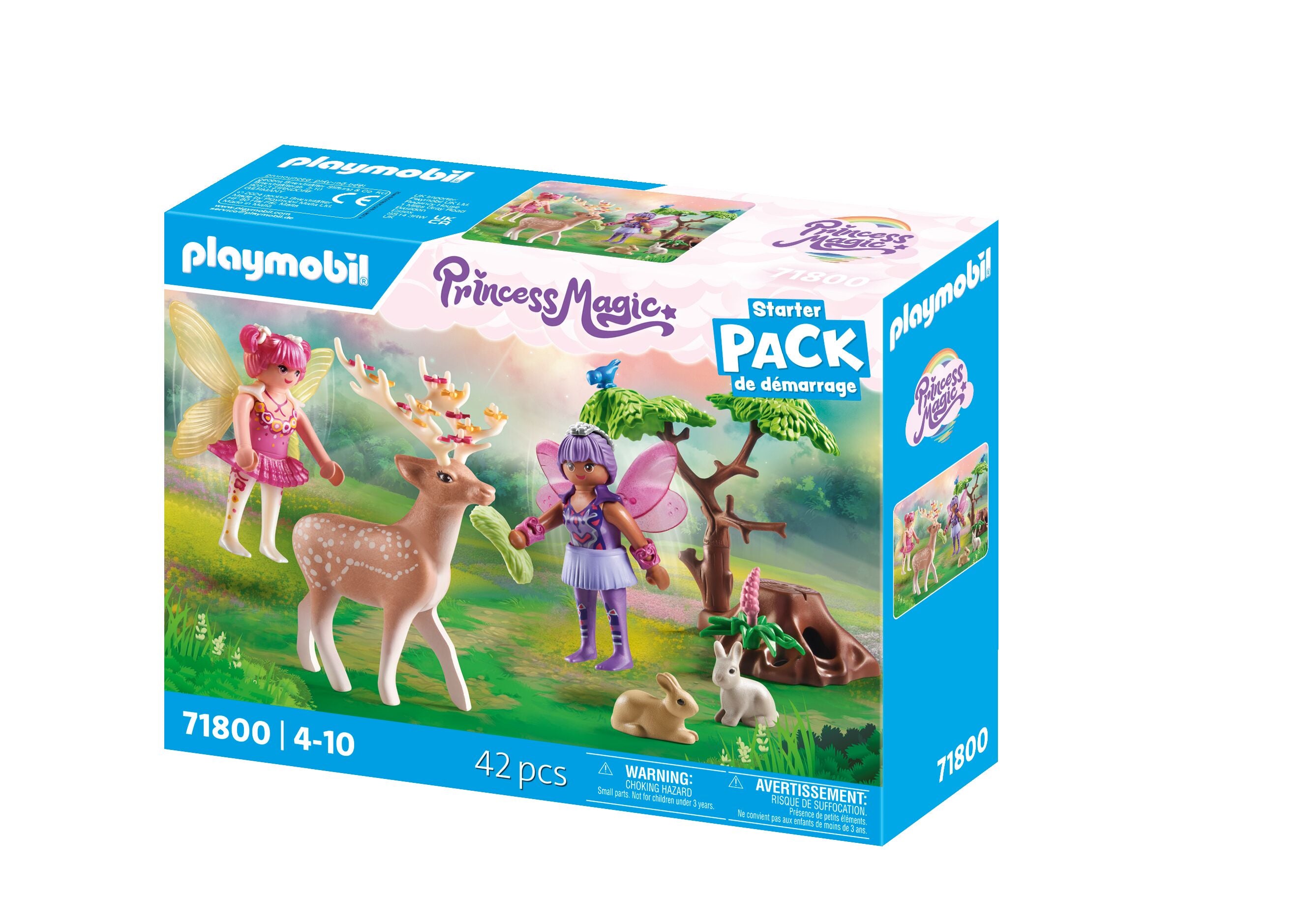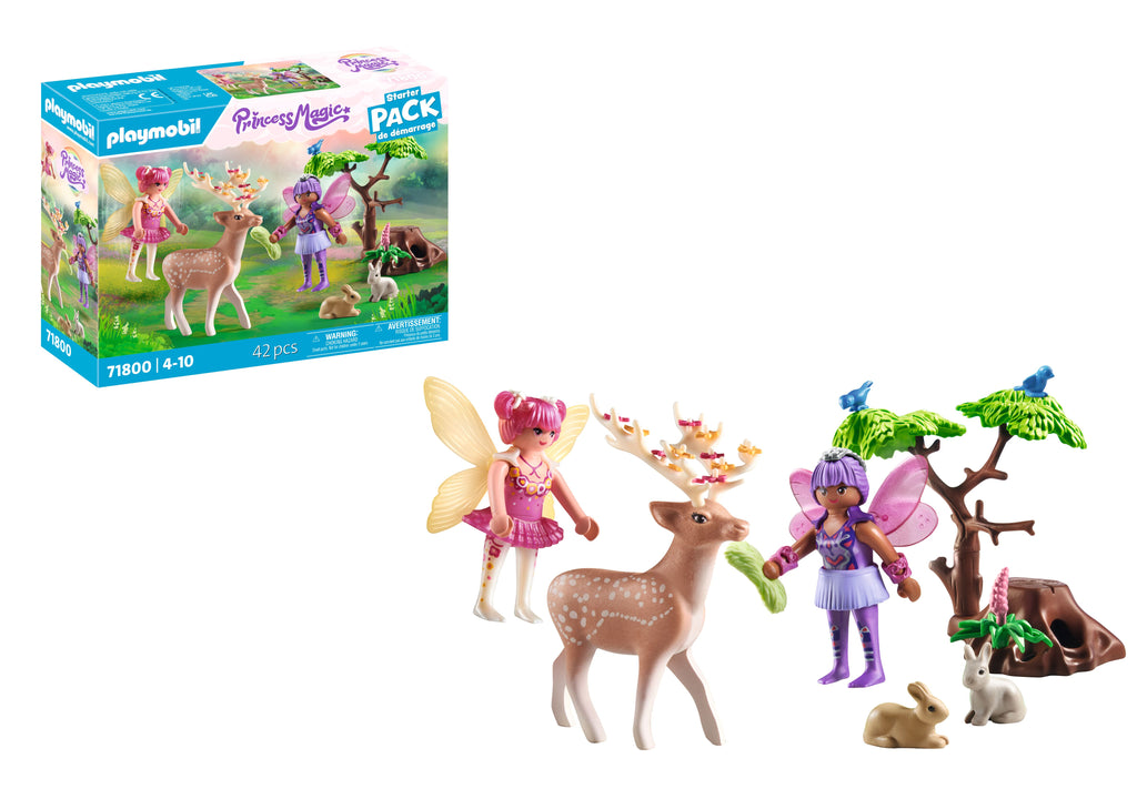 Two friendly forest fairies lovingly care for the animals of the forest. One of the fairies adorns the majestic deer with colorful flower blossoms while it is gently fed. Two curious rabbits and two lively birds enrich the magical set and ensure lots of fun.