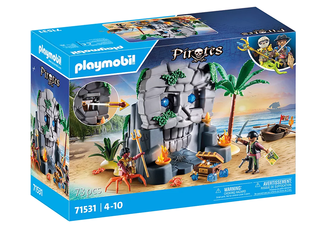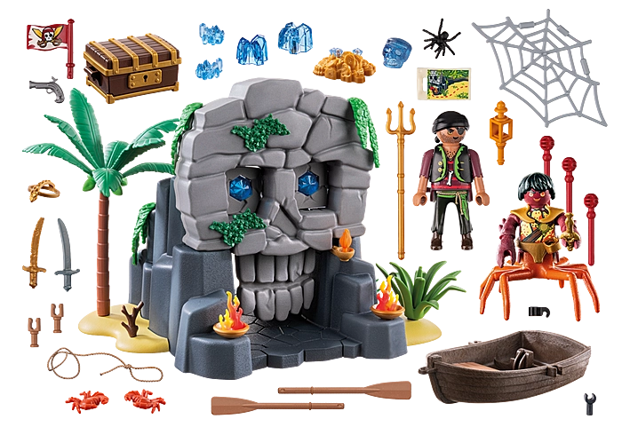 Dare to discover the legendary PLAYMOBIL Skull Island, where hidden treasures await behind secret traps. A fearless pirate must outsmart the island’s defences and defeat the fierce Crab Deeper before claiming the glittering loot.