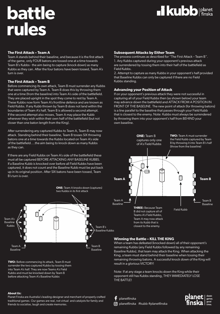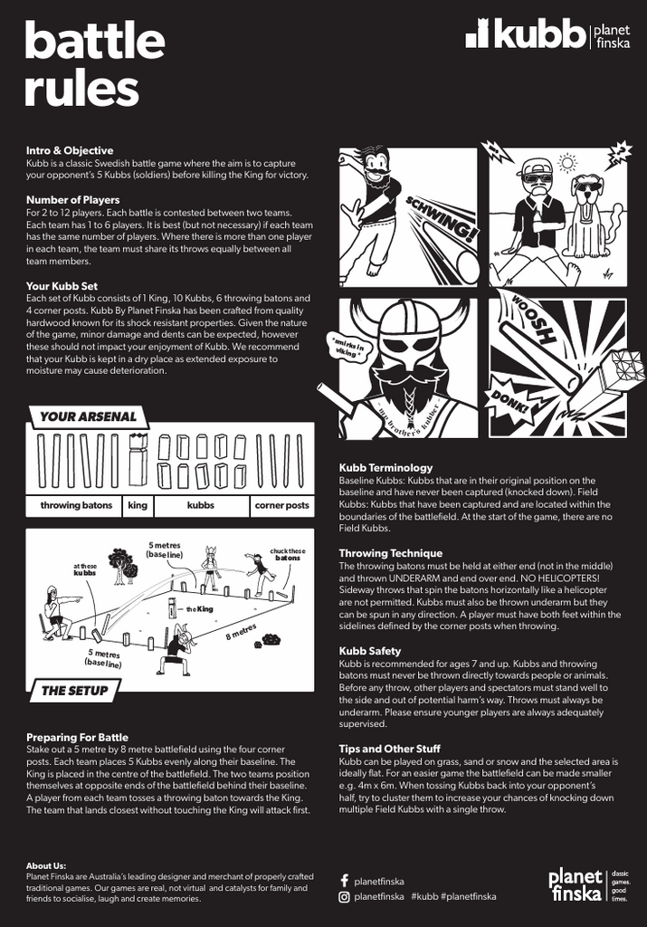 In keeping with Nordic tradition, our original Kubb set is crafted from eco-friendly birch (a shock resistant tough hardwood). All timber pieces and edges are sanded smooth. Over time, your original Kubb will enjoy a light rub with Danish oil or equivalent timber oil from time to time for preservation and protection.