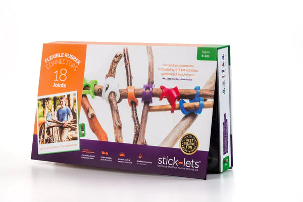 The 18-piece Mega Fort Set will kick-start your imagination as you engage with Mother Nature. The patented stretchy connectors will help you create a world of wonder and fun on your next adventure. Build large or small structures with natural materials gathered from the outdoors. Ideal for fort building, camping, classroom projects, team building, gardening, and more.