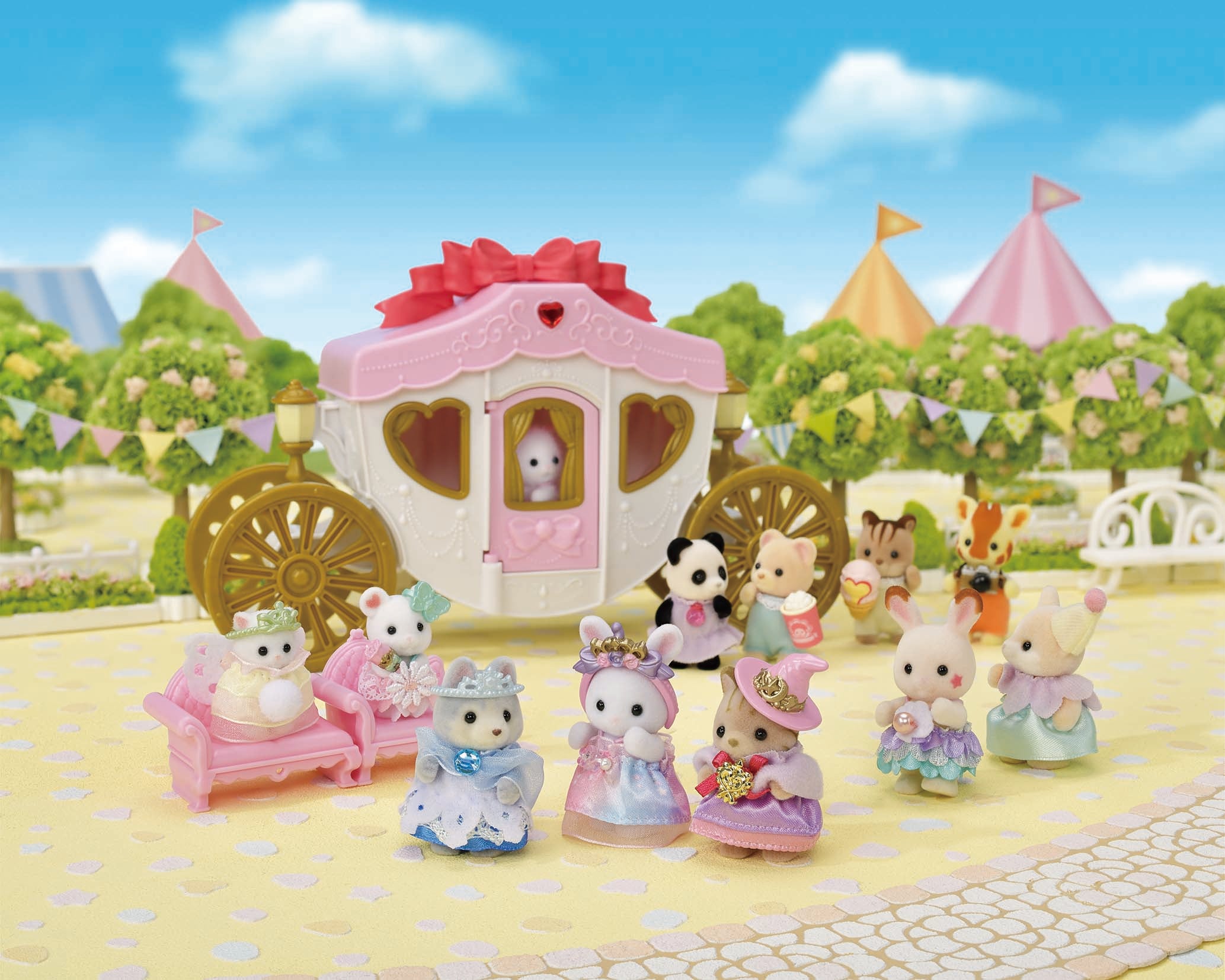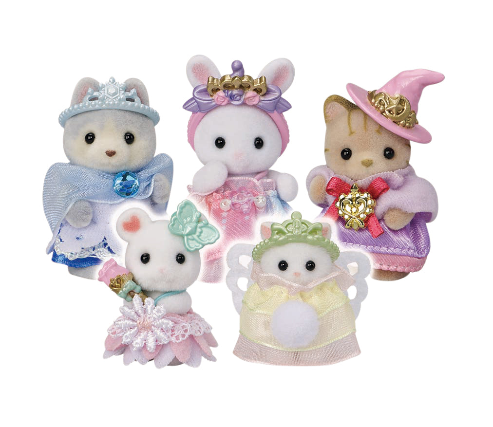 The Royal Princess Set is a magical collection of baby figures dressed in gorgeous princess costumes, each bringing their own royal charm to imaginative adventures. This enchanting set features diverse princess themes—from Snow Rabbit baby Sophie as a classic Snow Princess to Husky baby Linnea as a stunning Snow Princess, Striped Cat baby Apricot in her regal costume, Marshmallow Mouse cradled baby Mary, and Persian Cat cradled baby Briana. Each character is uniquely dressed, celebrating different princess interpretations and fantasy styles.