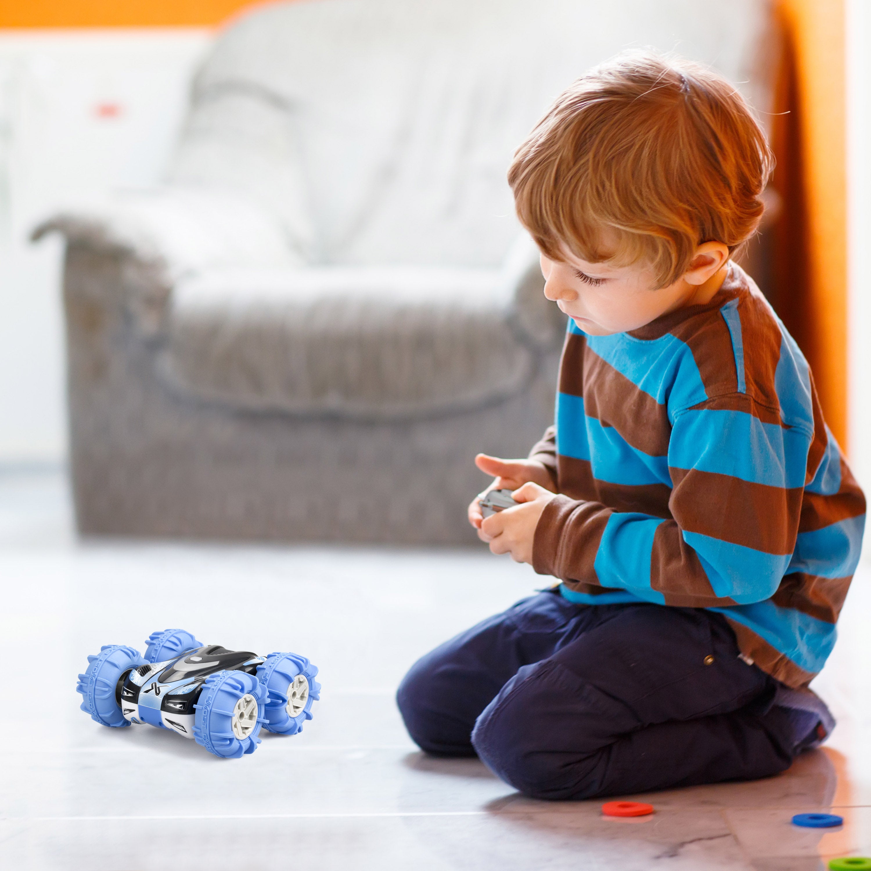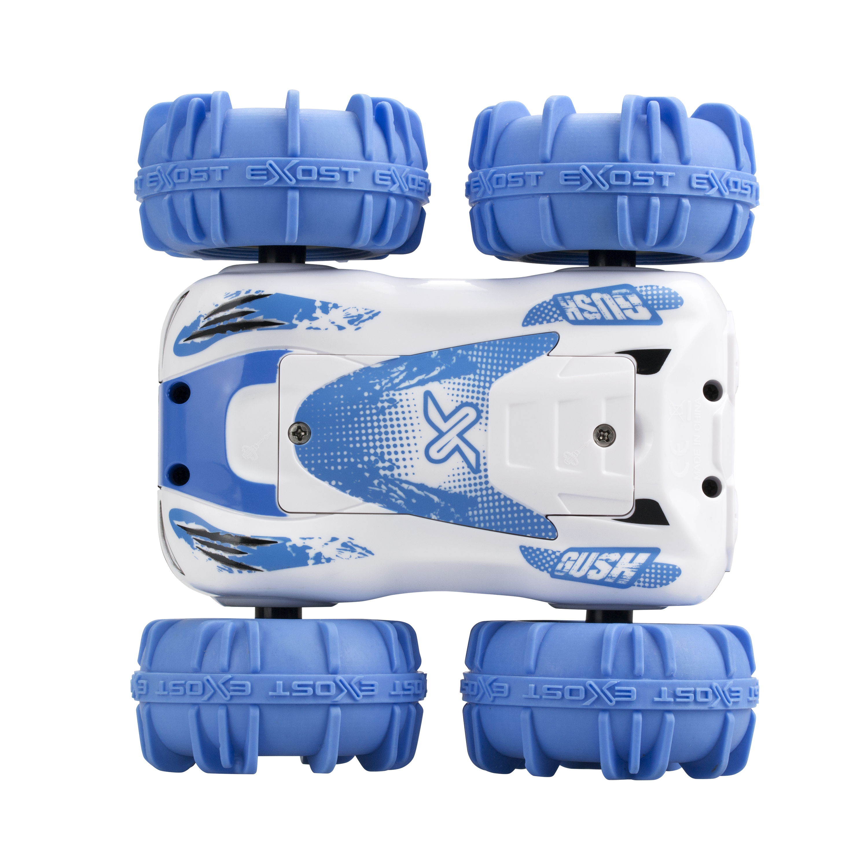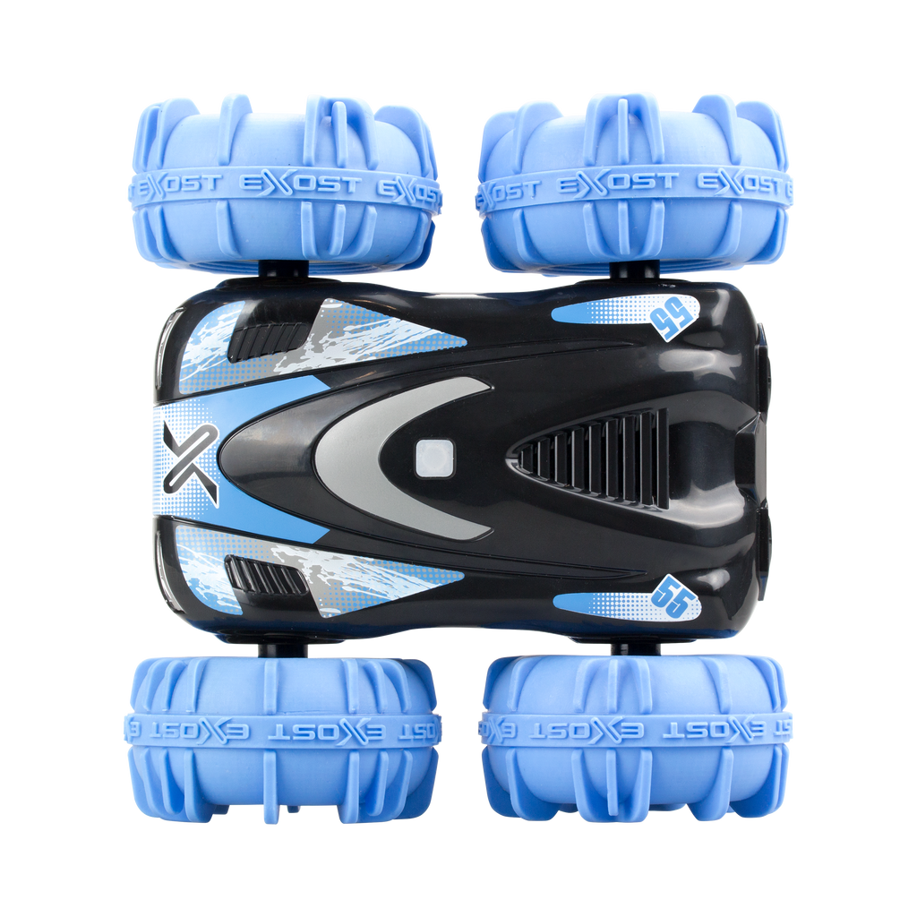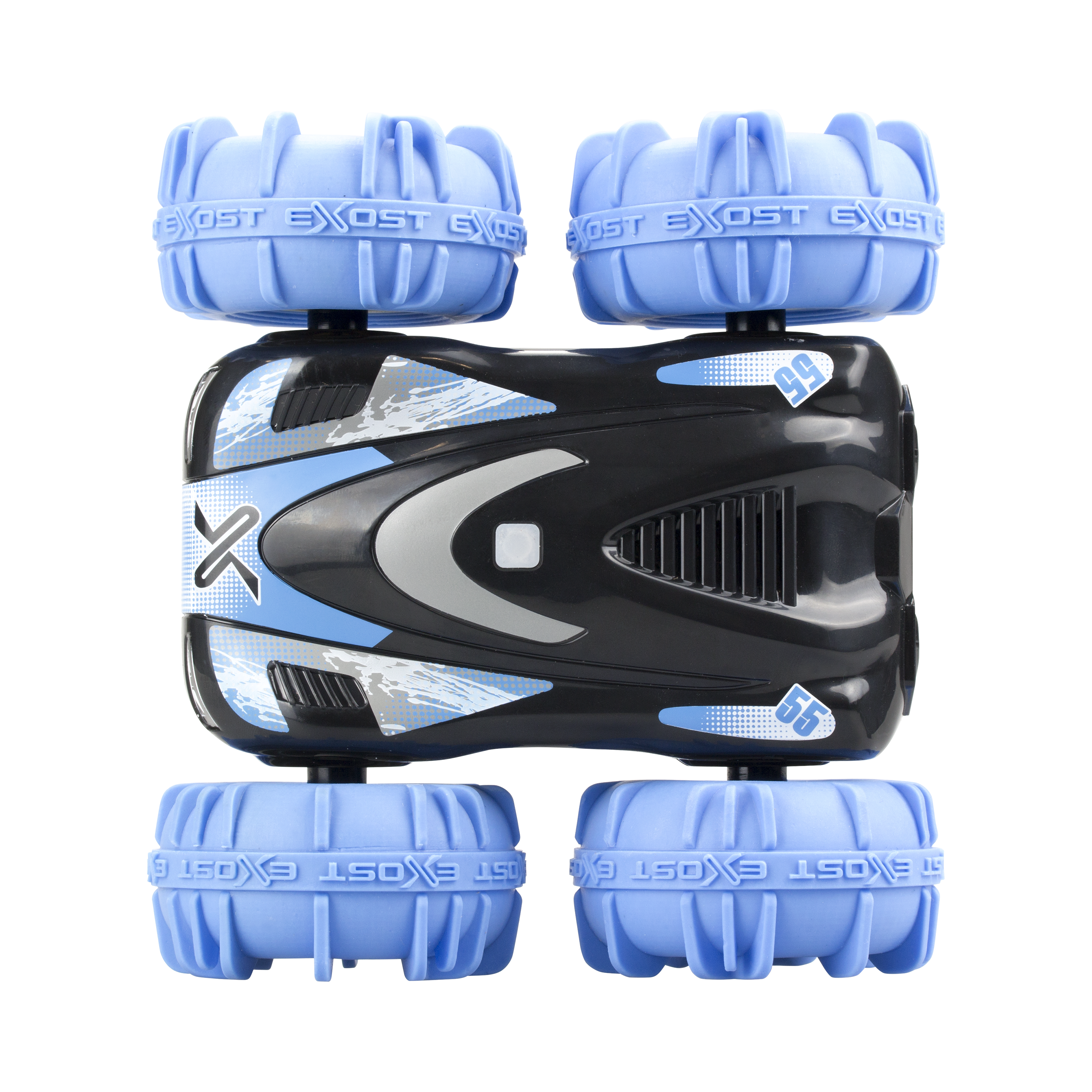 Master the Stunts and Defy all Terrain! 360 AquaCross can tread on Land and Water! Soft yet Durable Exost Tires with 2.4 GHz transmission which can support multiple players. It also can run on 2 sides and includes rechargeable battery!
