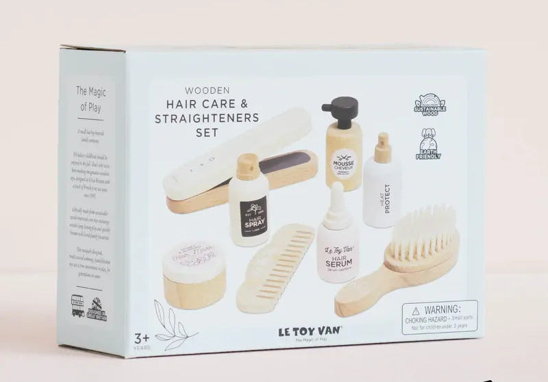 Style and shine! Little hairdressers will adore this beautifully crafted Hair Care & Straightener Set, perfect for imaginative salon play. Featuring a stylish color palette of cream, natural wood, soft blue, and pink with chic black detailing, this set is as charming as it is fun.