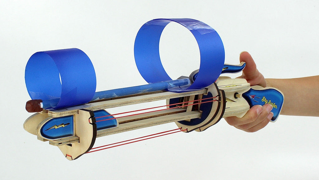 Sky Surfer launches straw, styrofoam, cardboard and balsa wood – or combinations of all of those! For sure you can throw a paper airplane farther, but with this you can have a perfectly repeatable launches to test the changes in designs that you make – and you can change the launch power by adding elastics.