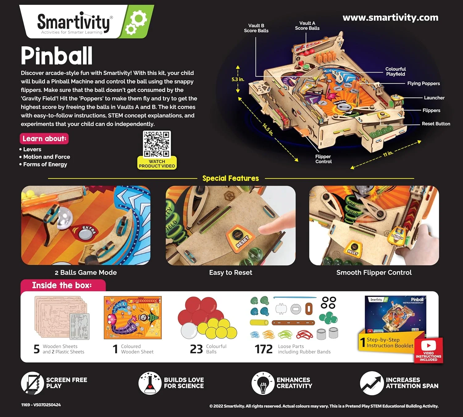 Perfect for ages 8 - 14, the Smartivity DIY Pinball Machine encourages problem-solving, creativity, and fine motor skills, all through screen-free entertainment.