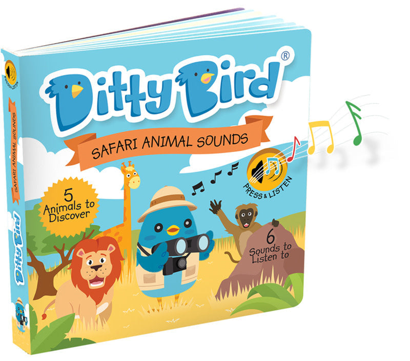 Baboon Lion Elephant Giraffe and Hippo. Ditty Bird books have been specifically designed to promote language skills, auditory development and music appreciation. Each book features curved corners for safety, bright colourful illustrations and children can work their fine motor skills through the engaging sound buttons. Wonderfully sturdy, these board books can be read over and over again providing easy to turn pages for little hands.