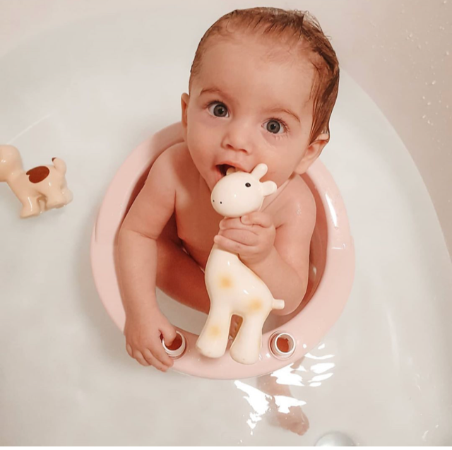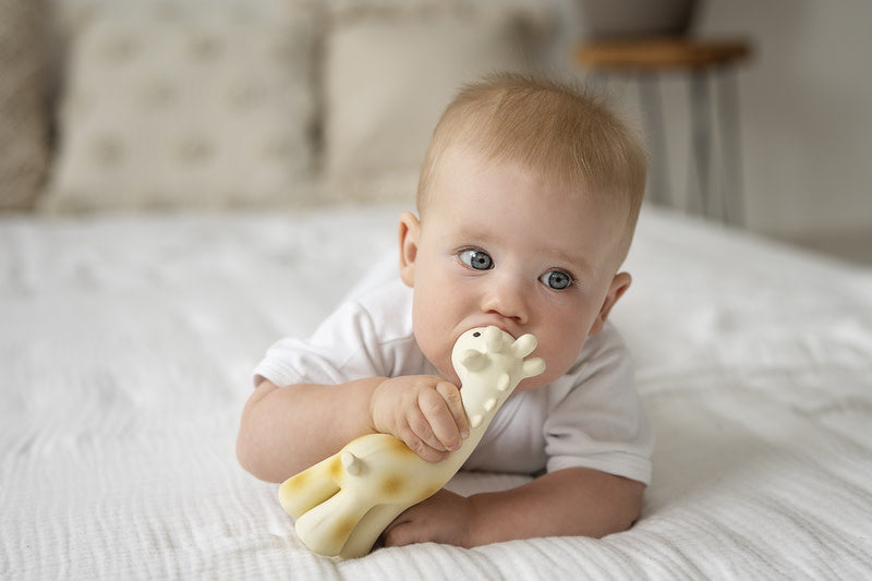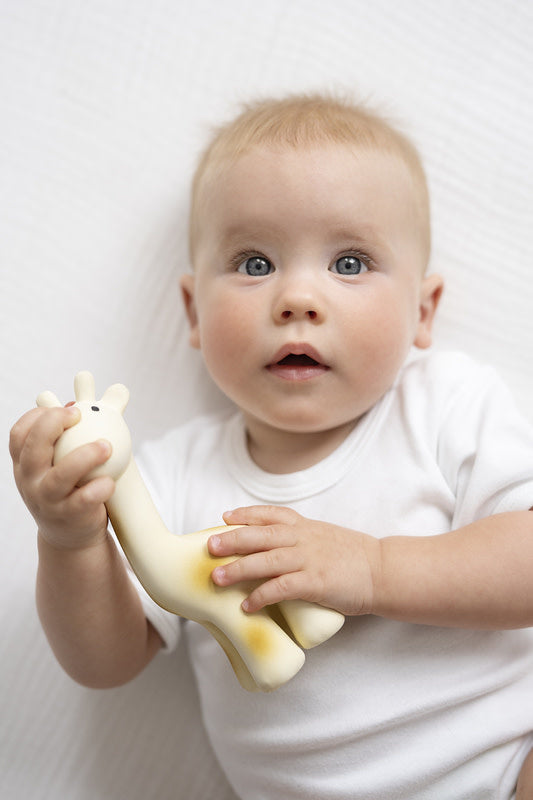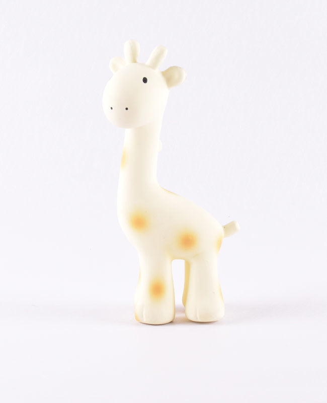 An adorable all rubber giraffe teether that is great for little hands to grab and squeeze. Features a little bell that rattles inside to delight and entertains little ones.
