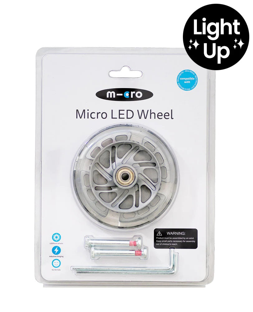 These motion-powered LED wheels generate light through dynamo mechanics. Which means there is no need to worry about replacing batteries or the lights going out. Super easy to put on your Micro Scooters - a one step process to brighten up your scooting adventures. If you're having trouble getting your wheels off, check out our how to replace the Mini/Maxi Wheels step by step instructions.