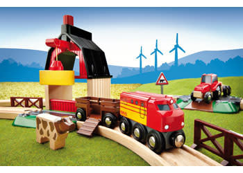 Out on the farm, life is quiet. The cow and horse are out on pasture while the tractor is taking the hay load to the barn. The crane lifts the hay up onto the loft. When it´s time for the animals to move indoors, place them on the wagon with help from the fold out ramp and transport the wagon with the farm engine.