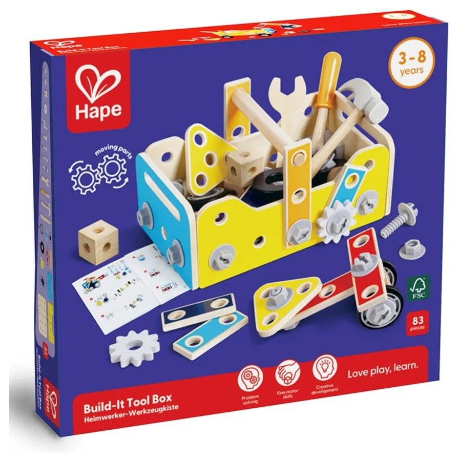 Unleash creativity the Hape 83 Piece Wooden Build-It Tool Box with Accessories Playset, packed with accessories and designed for hands-on skill development and imaginative DIY activities. The set includes a mix of wooden and plastic pieces like screws, nuts, and tools, helping children build projects while developing S.T.E.A.M. skills such as creativity, spatial reasoning, and problem solving. With easy storage, a carry handle, and building guides for different skill levels, it's perfect for budding builders of all ages.