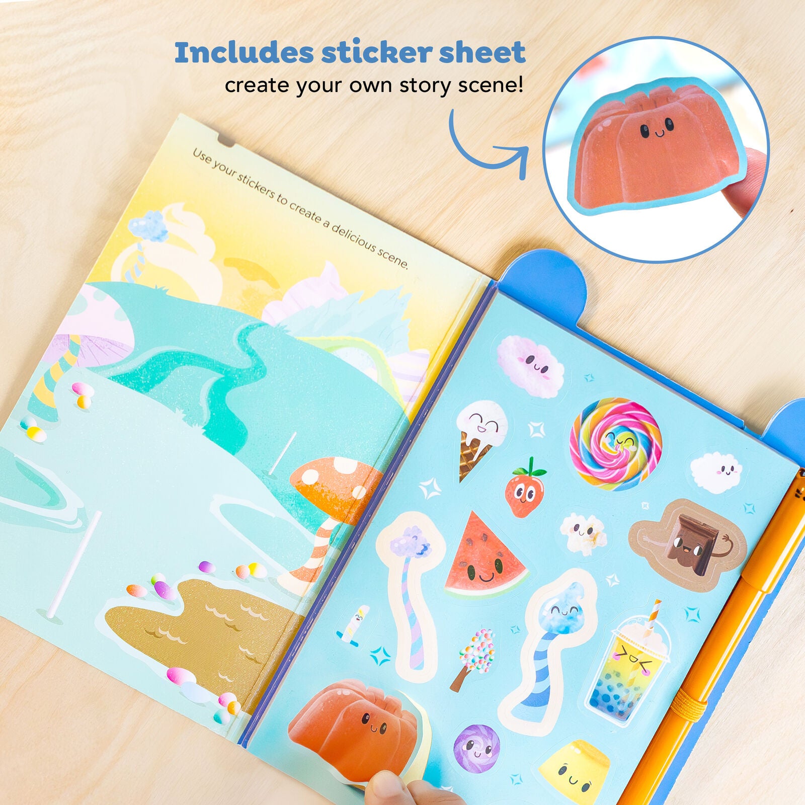 Sticker sheet and matching scene for imaginative storytelling