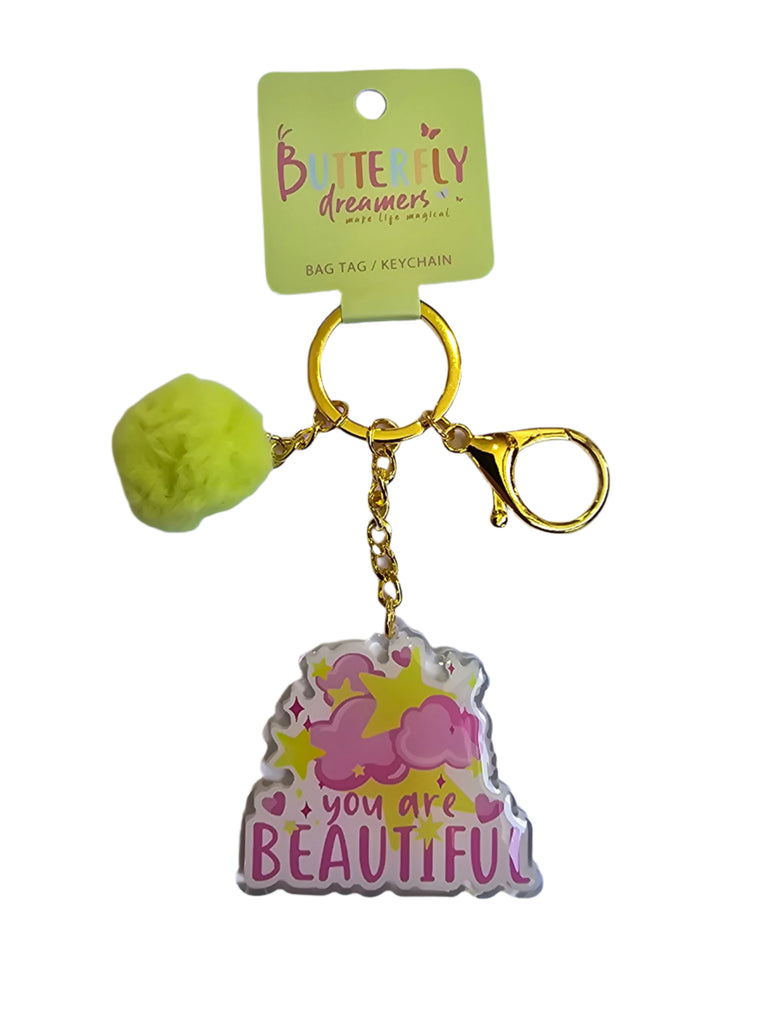 Elevate your daily essentials with our Butterfly Dreamers Keychain 'You Are Beautiful'. Complete with a burst of vibrant color from a charming Greenpom pom, let your bag or keys reflect your individuality. 'You Are Beautiful'
