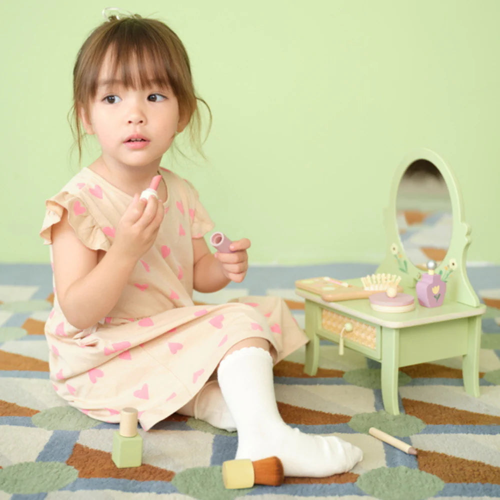 Complete with pretend beauty essentials like a perfume bottle, makeup brush, lipstick, powder compact, and eyeshadow palette, every detail is crafted to spark creativity and role-play fun.