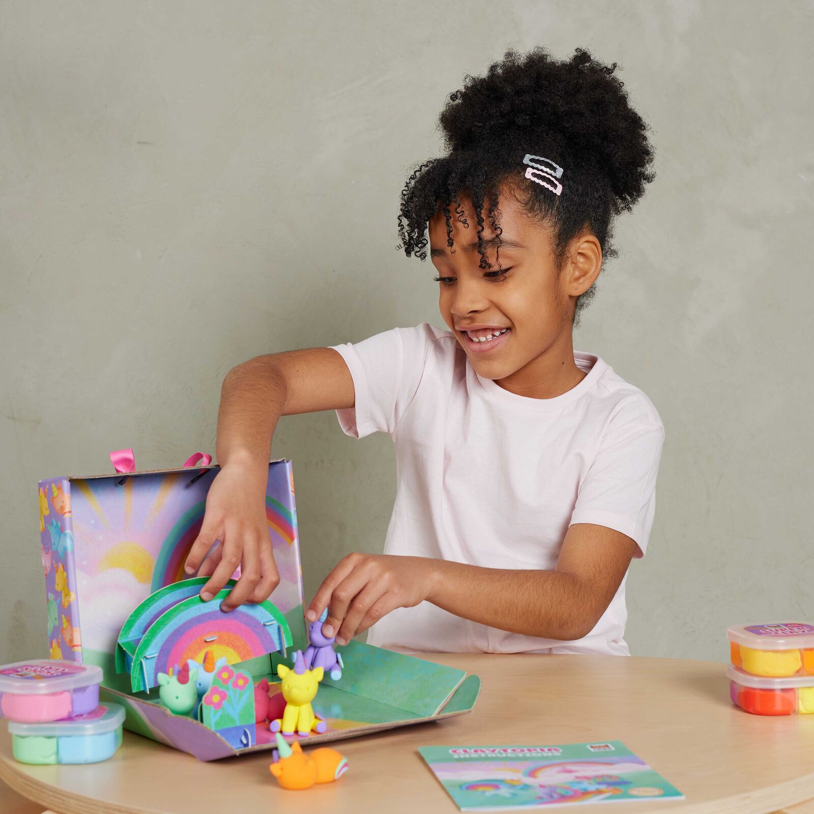Includes: 10 colours (160g) of air-drying clay to make 6 unicorns, 1 sculpting tool, 2 pop-out accessory sheets, built-in play scene, visual instructions
