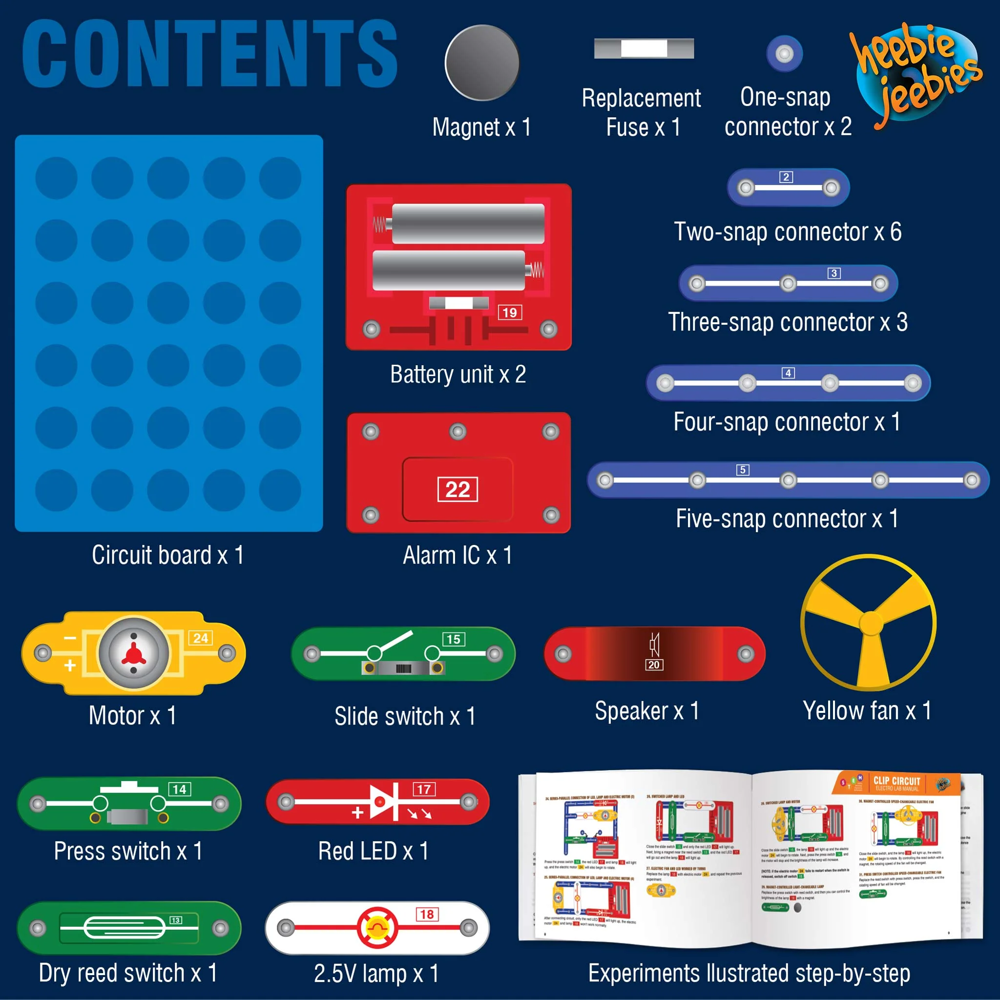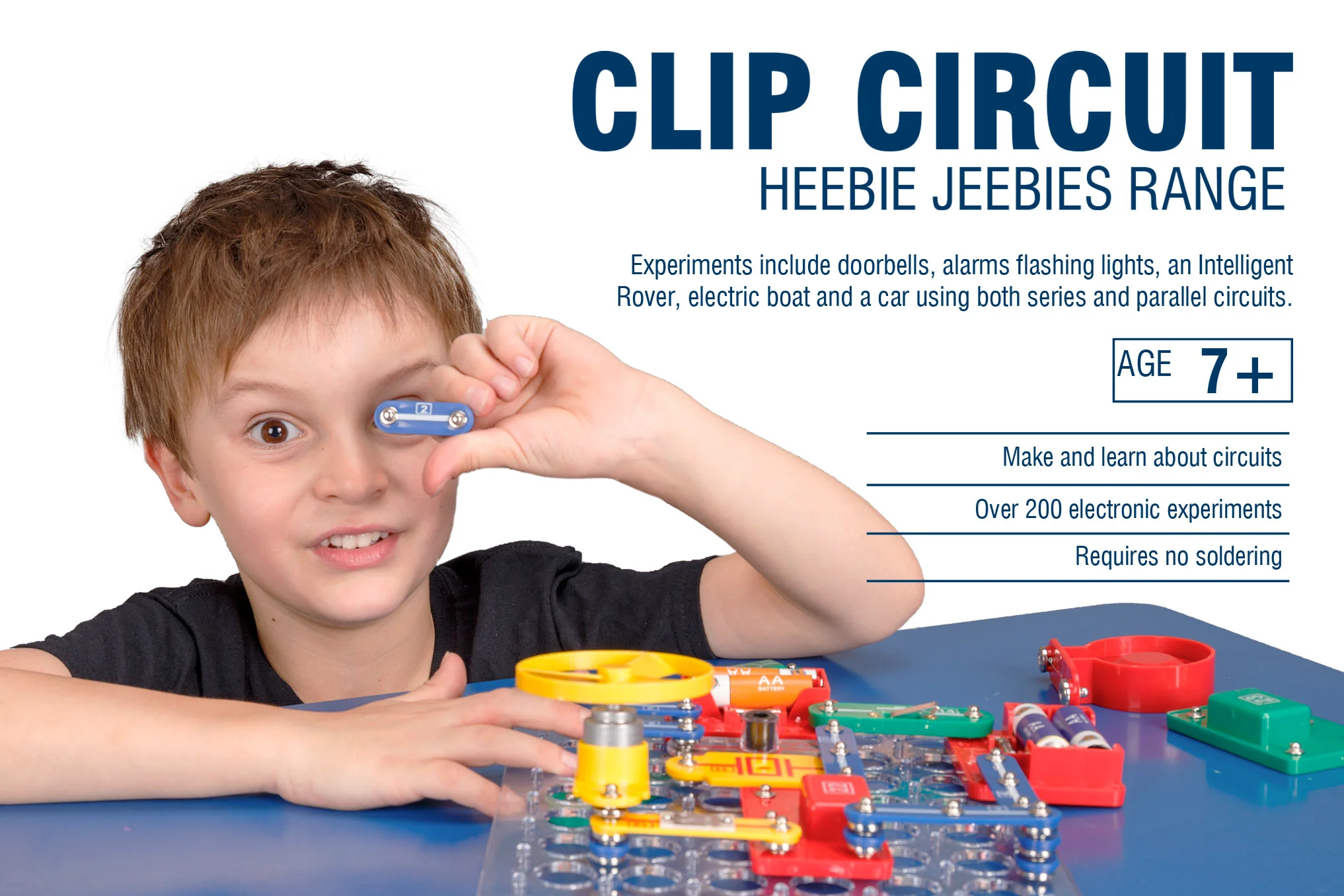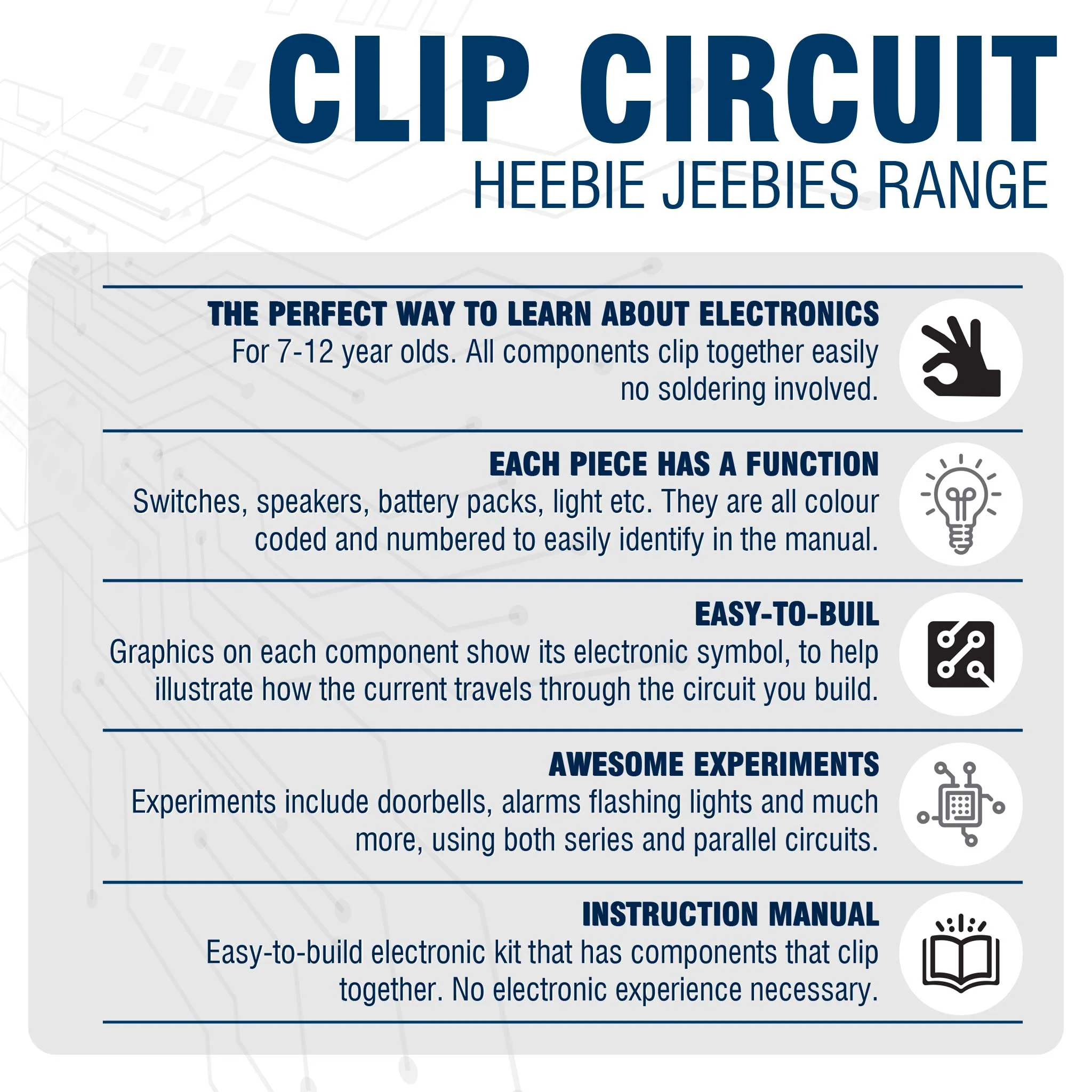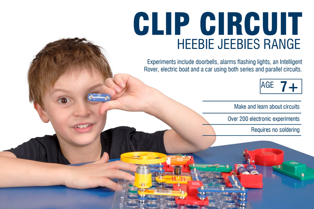 Get hands on and discover the fascinating world of electricity with this Clip Circuit kit. Simple snap together pieces to create circuits that will allow you to create doorbells, alarms, and flashing lights. Each piece has clearly labelled graphics of the current flow, so your child can learn all about how electricity flows.