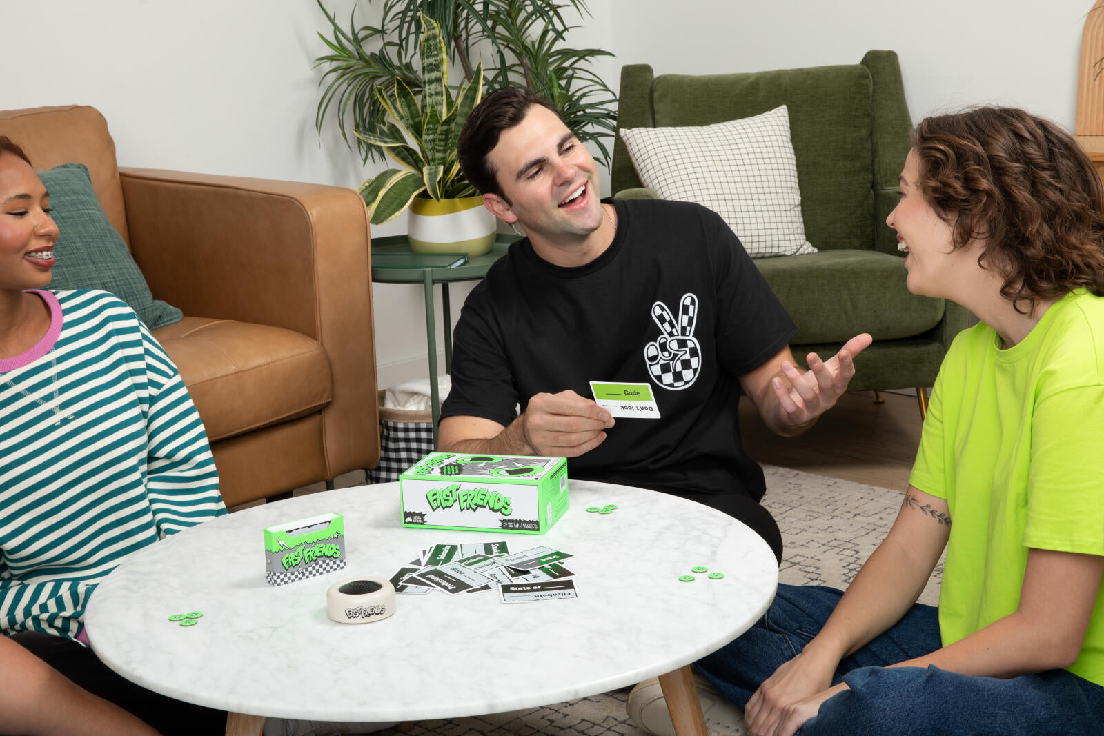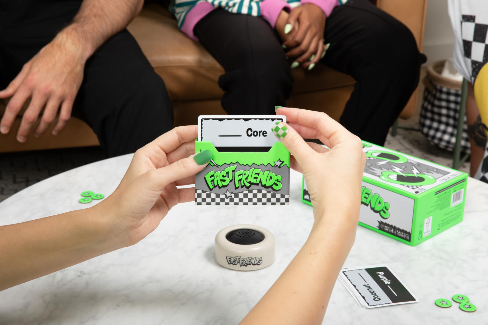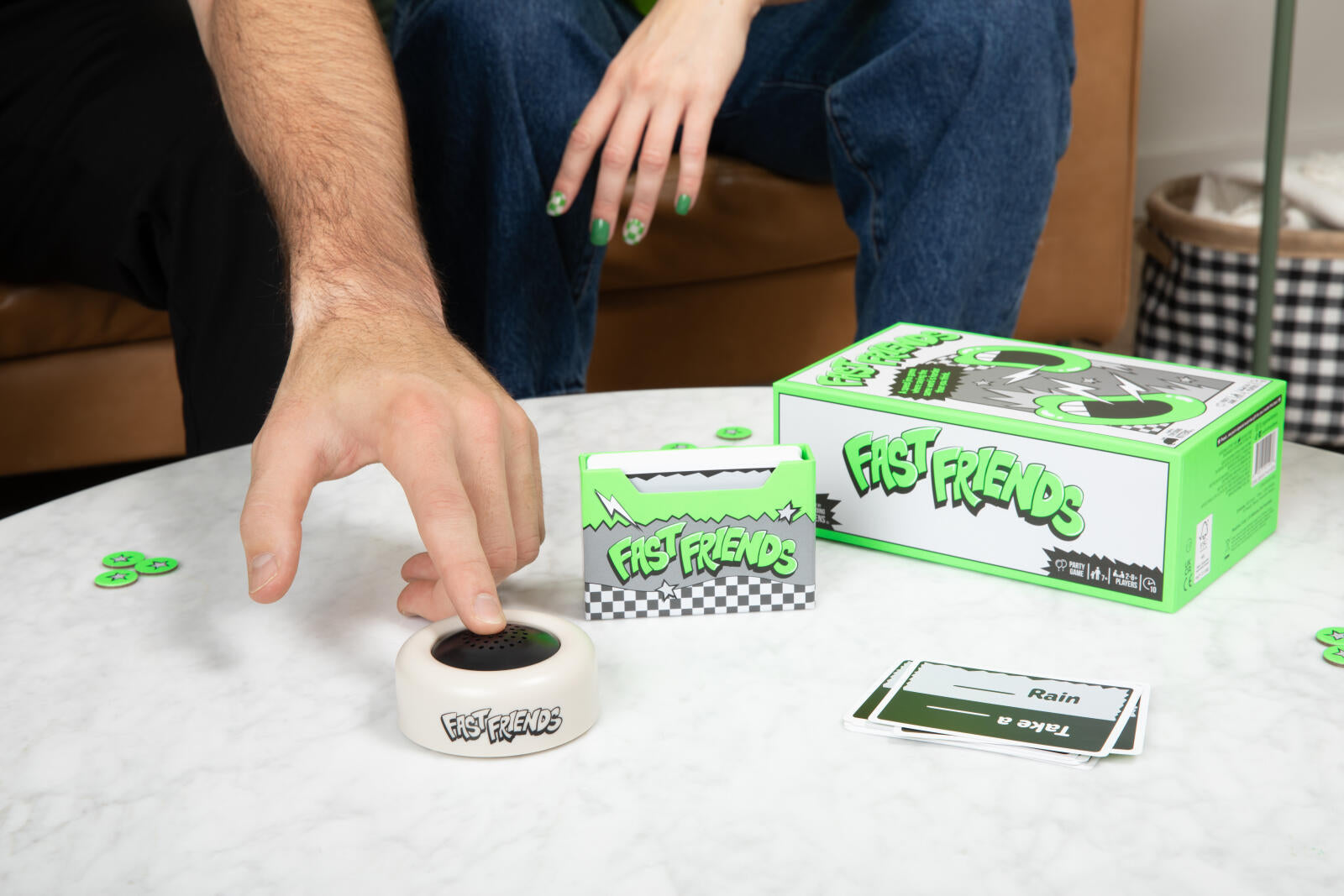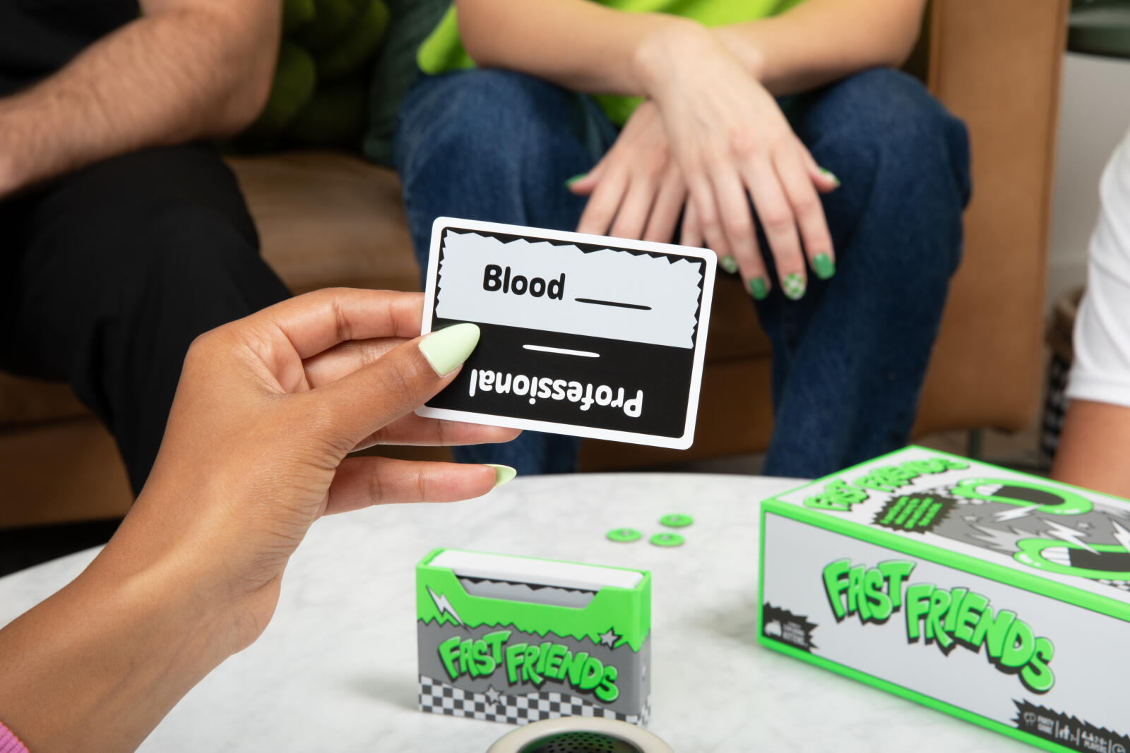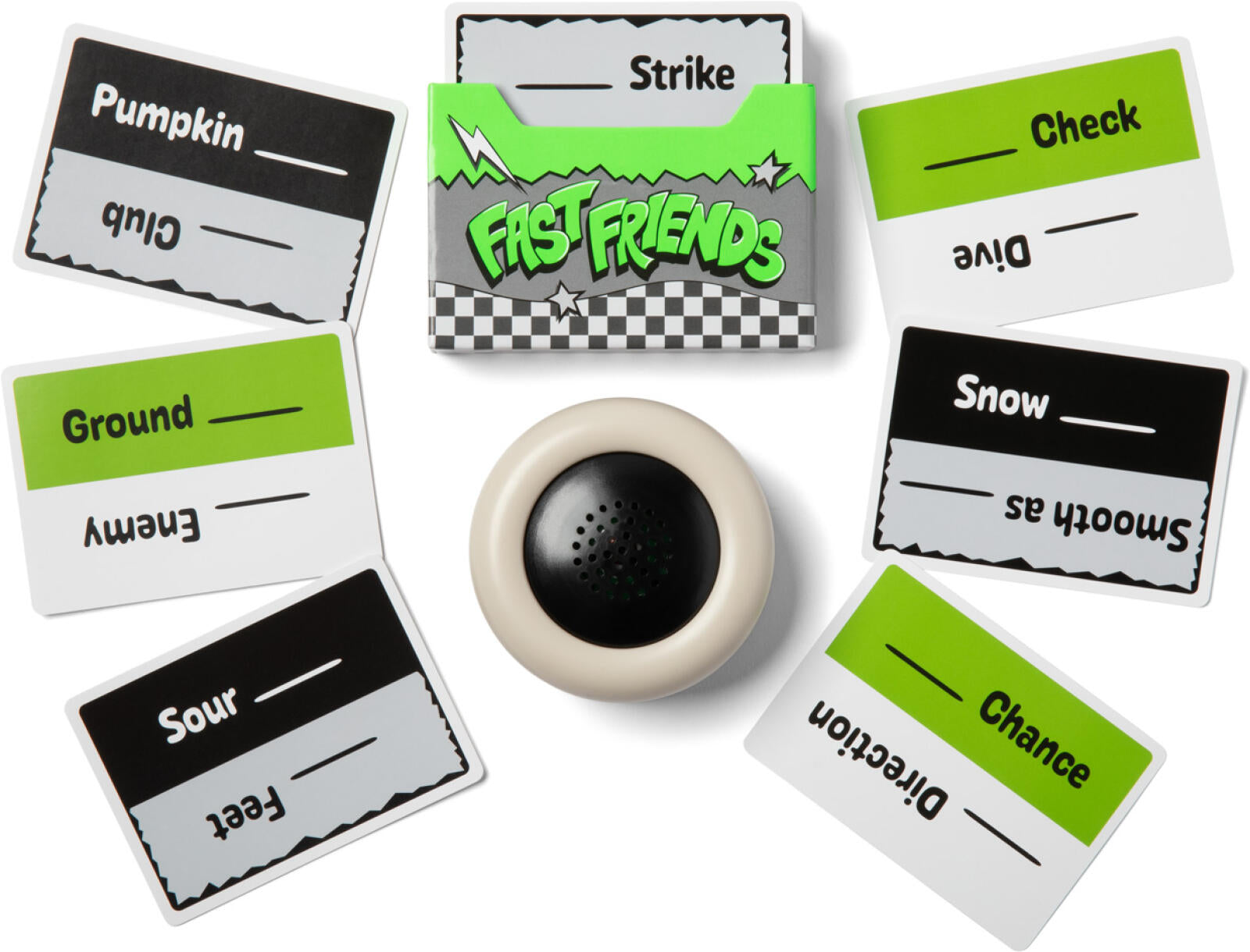 Set the timer and read the word on your card. On the count of three, you and the person to your left have to say the same associated word in unison. If you fail, go again until you match. But hurry, you don’t want to be caught when the timer goes off.