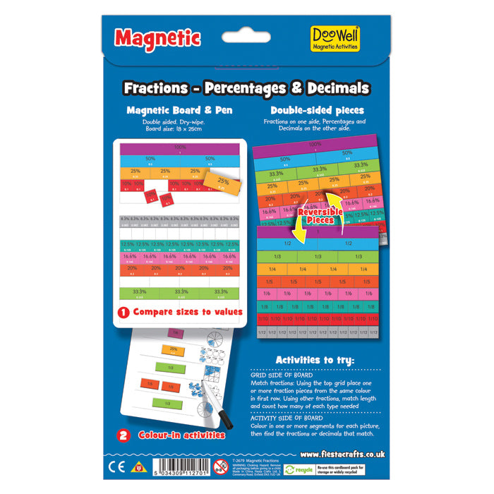 It's reversible - turn to learn! Erasable pen, backing board and 51 magnetic pieces to teach percentages and decimals. On one side a fraction is listed, flip the piece and the other side has it's equivalent percentage. The board has pictures to colour with the marker reflecting those fractions to give a visual understanding. Brilliant for the kids who are moving just past the basic maths concepts!