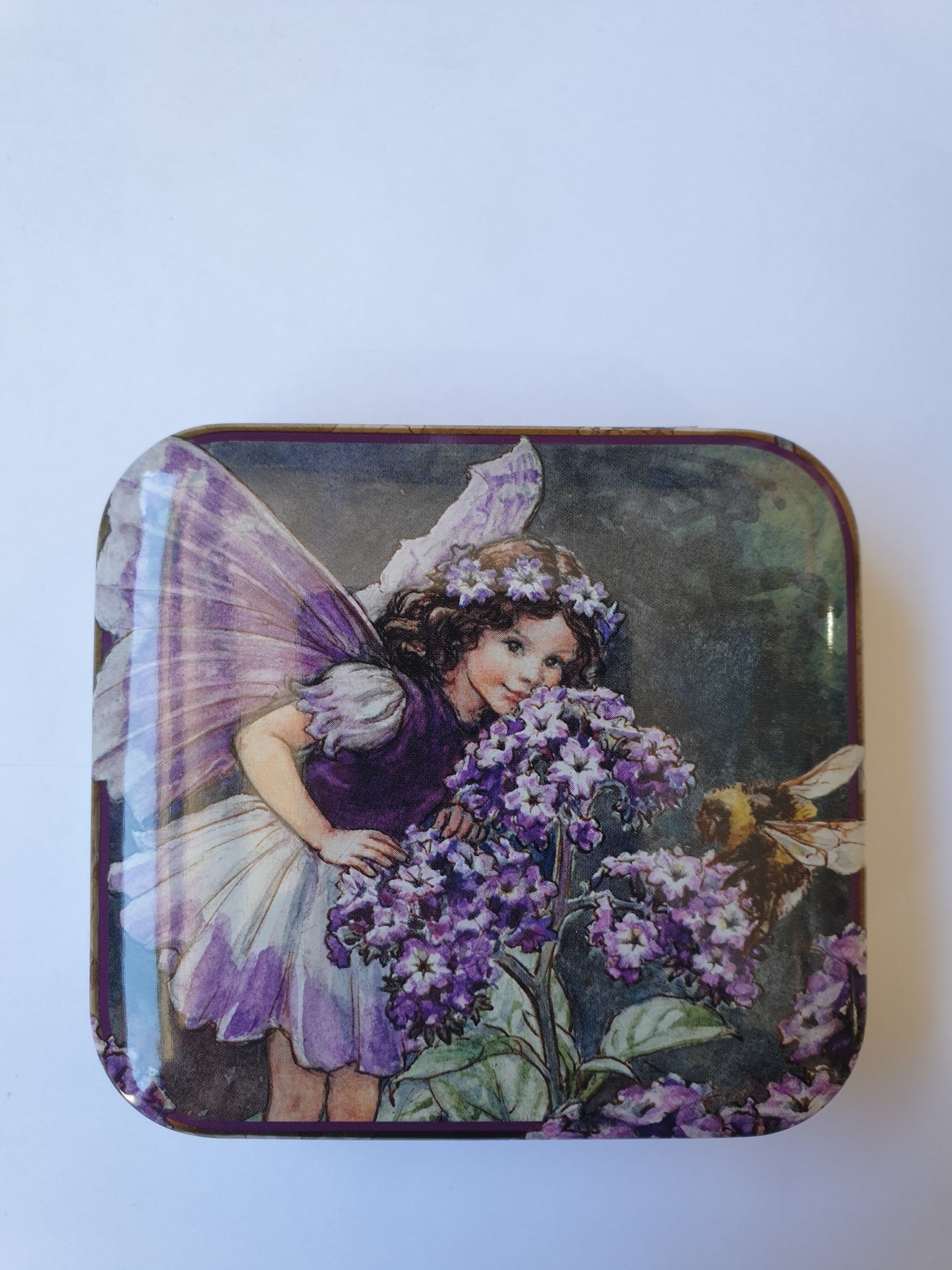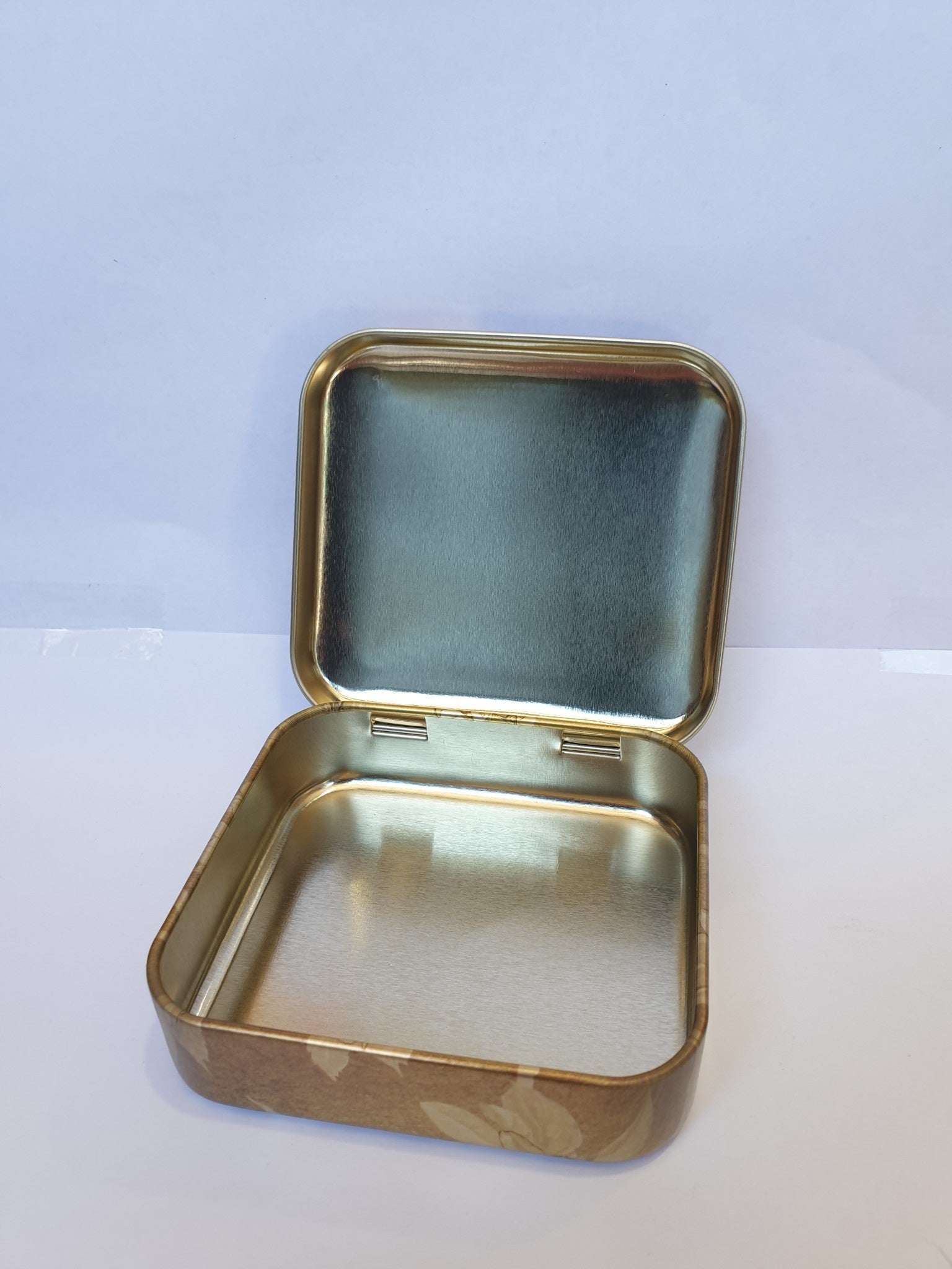 A tin with a hinged lid which can be used to store small items and keepsakes