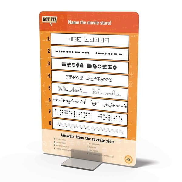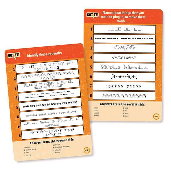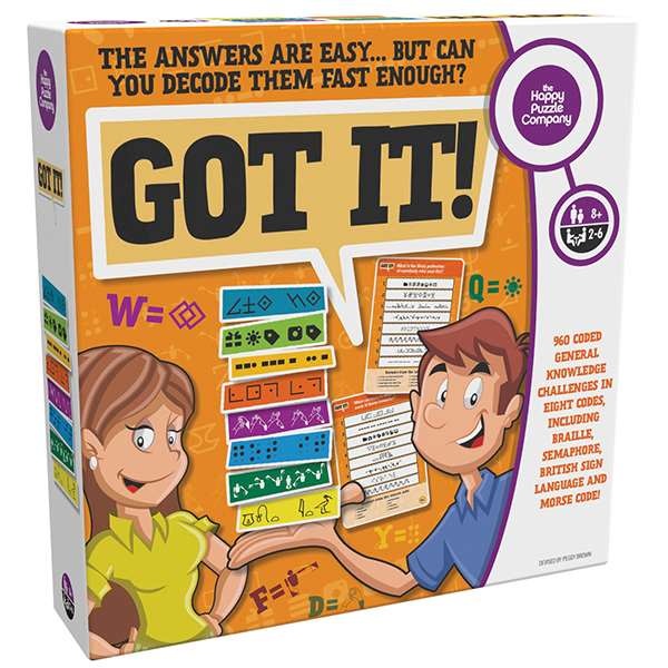 Got It! features 960 questions and answer challenges covering a wide range of family-friendly subjects, using commonly used codes, including Braille, Semaphore, British Sign Language and Morse Code, plus others that you probably never even new existed! Box size approx 27cm x 27cm