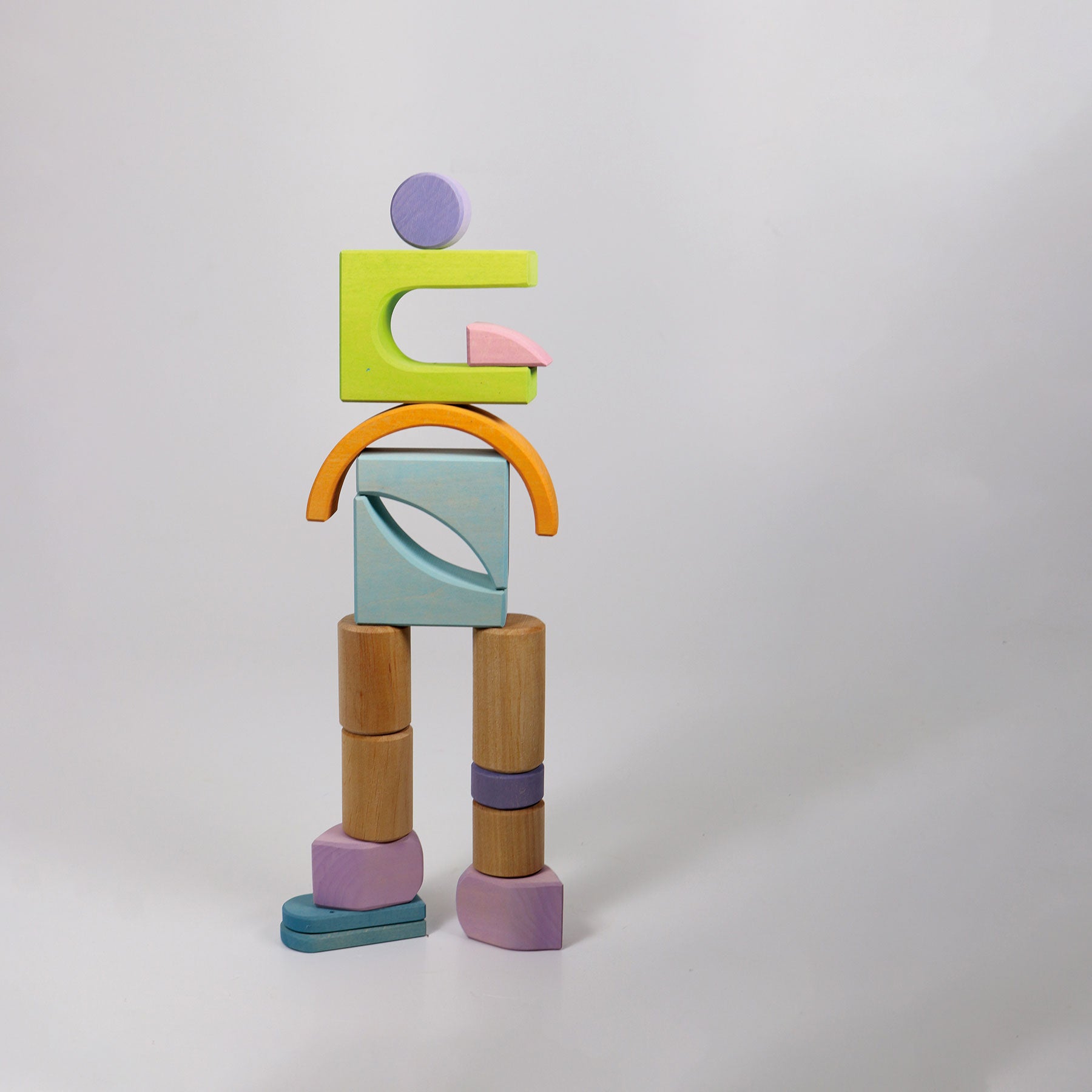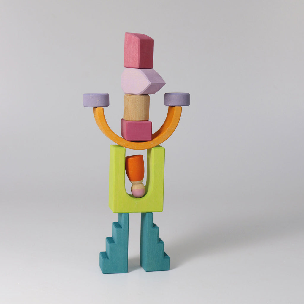 Grimm’s Building Worlds come in a handy frame and are just waiting to burst it with the imagination of a child. They are practical small Building Sets promoting exceptional small Play Worlds. Perfectly incomplete, they invite you to add your imagination and create new worlds. The pastel airy tones of the Building World Cloud Play give the solid wood a delicate lightness. The building materials come in a wide variety of shapes allowing imaginative free building and will complement the GRIMM’S assortment with their wonderful details, such as flower-like curves, asymmetrical edges and a mountable, movable door.